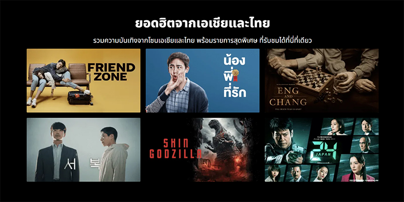 - ภาพยนตร์ไทยเรื่องใหม่ เช่น ห้าวเป้งจ๋าอย่าแกงน้อง และซีรีส์ Extraordinary Siamese Story : Eng and Chang ซึ่งเป็นเรื่องราวชีวิตของอิน-จัน แฝดสยามคู่แรก พร้อมหนังดังตลอดกาลและติดอันดับทำรายได้สูงสุด อาทิ พี่มาก..พระโขนง, เฟรนด์โซน, น้อง.พี่.ที่รัก, ลัดดาแลนด์, ชัตเตอร์ กดติดวิญญาณ และต้มยำกุ้ง ฯลฯ รวมถึงละครซีรีส์ที่พร้อมสตรีมแบบเอ็กซ์คลูซีฟทุกสัปดาห์ อาทิ Love and Fortune และ รักแลกภพ