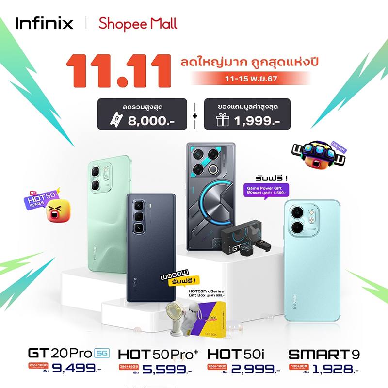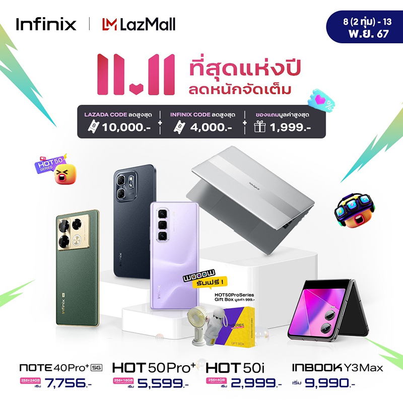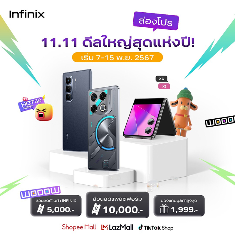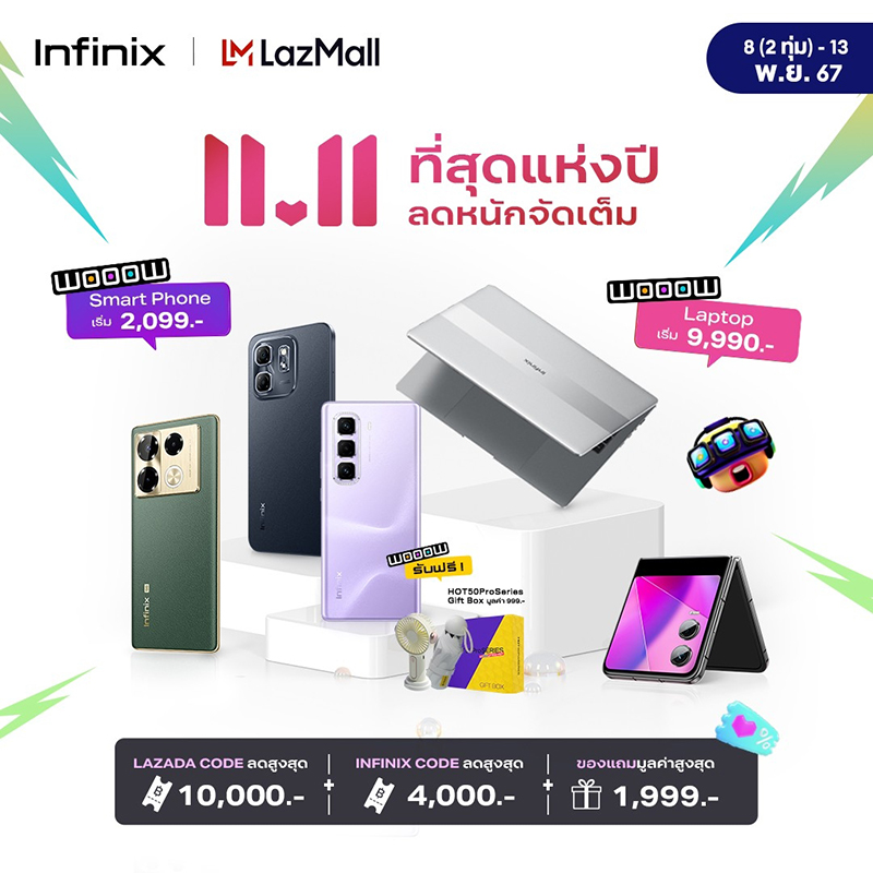 Infinix (อินฟินิกซ์) แบรนด์สมาร์ทโฟนระดับโลกราคาคุ้มค่า ครบครันทุกการใช้งาน และตอบโจทย์ไลฟ์สไตล์คนรุ่นใหม่ ส่งโปรแรงแห่งปีกับแคมเปญ 11.11 พาเหรดสมาร์ทโฟนและแล็ปท็อปที่มาพร้อมดีลเด็ดรับส่วนลดรวมสูงสุดกว่า 10,000 บาท!