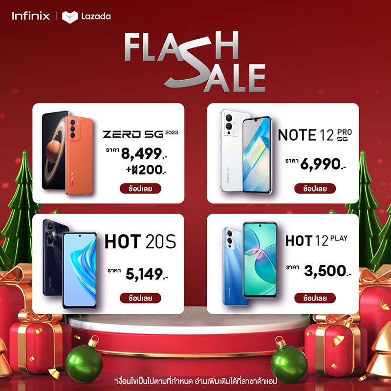 อินฟินิกซ์ (Infinix) แบรนด์สมาร์ตโฟนระดับโลก ร่วมสร้างสีสันเติมเต็มบรรยากาศแห่งการเฉลิมฉลองส่งท้ายปี เอาใจนักช้อปออนไลน์ด้วยโปรโมชันปังๆ ในมหกรรมช้อปปิ้งสุดยิ่งใหญ่ 12.12 เซลใหญ่ ส่งท้ายปี ที่ให้ทุกคนเป็นเจ้าของสมาร์ตโฟนคุณภาพจาก Infinix พร้อมรับส่วนลดในช่วง Flash Sale สูงสุด 1,309 บาท ส่งฟรี ผ่อน 0% นานสูงสุด 3 เดือน เมื่อซื้อสมาร์ตโฟนที่ร่วมรายการจาก Infinix LazMall บน LAZADA ระหว่างวันที่ 12 – 14 ธันวาคม 2565 พบกับสินค้าไฮไลท์ราคา Flash Sale อาทิ