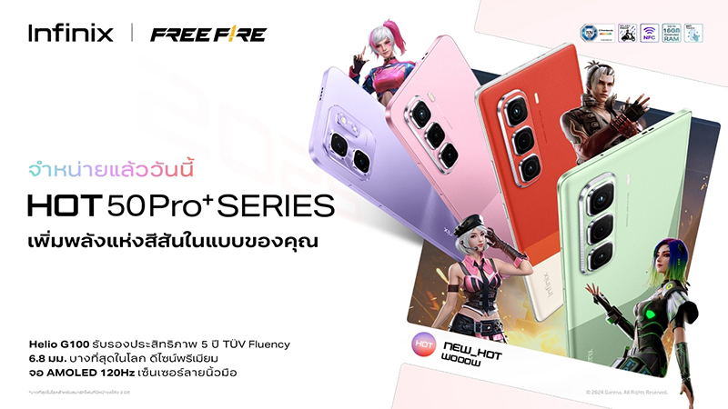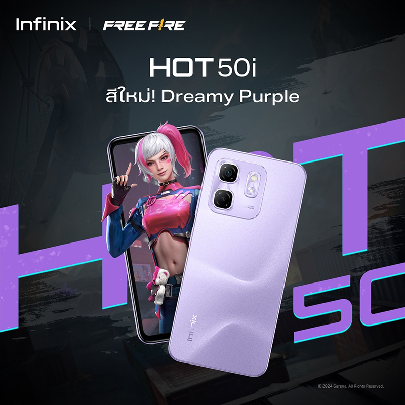 โดยยังคงฟังก์ชันการใช้งานจัดเต็มเพื่อประสิทธิภาพสูงสุดในการใช้งาน อาทิ ชิปเซ็ต Helio G100 ที่มอบประสิทธิภาพสูงสุดและได้รับการรับรองจาก TÜV SÜD สำหรับการใช้งานที่ลื่นไหลและยาวนานกว่า 60 เดือน ตอบสนองแบบ 16X Ultra-Resolution Touch และอัตราการรีเฟรชเรทสูงถึง 90FPS สำหรับ Free Fire มาในดีไซน์ Glimmer Ladder Design ที่ผสานสองวัสดุสุดล้ำอย่าง NanoFlex Fiber Leather เพื่อมอบความทนทานในการใช้งาน ตัวเครื่องบางเพียง 0.55 มม. ทำให้เป็นสมาร์ทโฟน 3D-Curved SlimEdge จอ AMOLED ที่บางที่สุดอีกด้วย ทั้งหมดนี้สะท้อนการออกแบบเพื่อผู้ใช้งานที่ผสมผสานทั้งดีไซน์เหนือระดับและประสิทธิภาพทรงพลังไว้ด้วยกันอย่างลงตัว ด้านรุ่น HOT 50i ก็มาพร้อมกับสีสันใหม่อย่าง Dreamy Purple (ม่วง) และฝาหลังดีไซน์แบบ Dualscape เพื่อสะท้อนความงดงามและเพิ่มลูกเล่นให้กับตัวเครื่องโดดเด่นมากยิ่งขึ้น
