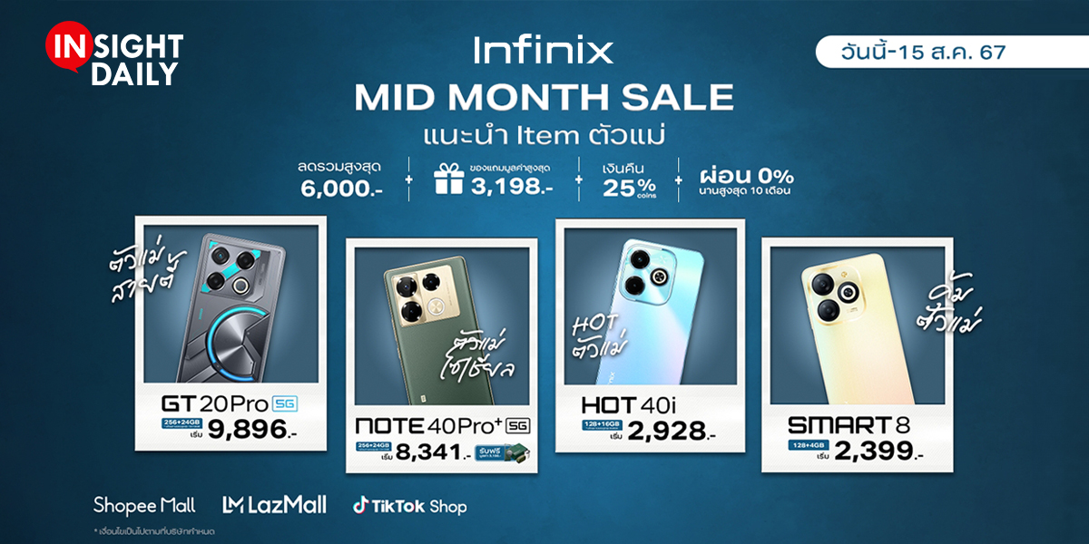 Infinix (อินฟินิกซ์) แบรนด์สมาร์ทโฟนระดับโลกราคาคุ้มค่า ครบครันทุกการใช้งาน และตอบโจทย์ไลฟ์สไตล์คนรุ่นใหม่ จัดโปรเด็ดดีลโดนกับ Mid-Month Promotion ขนทัพทั้งสมาร์ทโฟนและแล็ปท็อปมาเอาใจสายช้อปแบบกระหน่ำรับกลางเดือนที่ร้าน Infinix Official Store บน Shopee, Lazada และ TikTok Shop ตั้งแต่ 13 – 15 ส.ค. 67 โดยโปรดี ลดรวมสูงสุด 6,000 บาท + ของแถมมูลค่าสูงสุด 3,198 บาท + เงินคืนสูงสุด 25% + ผ่อน 0% นานสูงสุด 10 เดือน