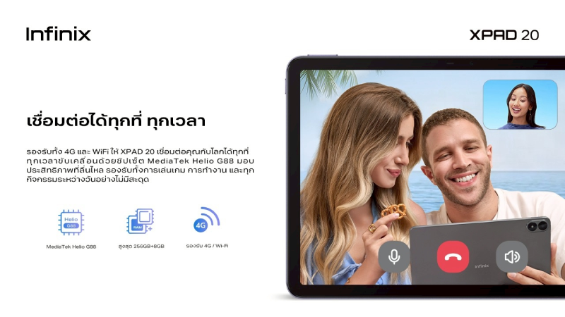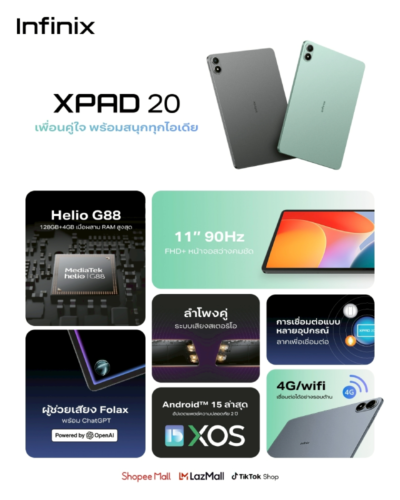 หลังจากเปิดตัวแท็บเล็ตรุ่นแรกของแบรนด์อย่าง XPAD ไปเดือนมกราคมที่ผ่านมา อินฟินิกซ์กลับมาอีกครั้งกับ Infinix XPAD 20 โดยรุ่นนี้โดดเด่นด้วยดีไซน์ที่ออกแบบมาให้พกพาได้อย่างสะดวกสบาย และรองรับการใช้งานที่หลากหลาย ด้วยโปรเซสเซอร์ MediaTek Helio G88 ที่ช่วยประหยัดพลังงานได้ดีเยี่ยมขณะใช้งาน พร้อม RAM 4GB ผสานได้สูงสุด 8GB และ ROM 128GB รองรับการเชื่อมต่อ4G และ MicroSD หมดกังวลเรื่องการเชื่อมต่ออินเทอร์เน็ต บนระบบปฏิบัติการ Android™ 15 รุ่นล่าสุด และได้รับการอัปเดตแพตช์ความปลอดภัยนานถึง 2 ปี