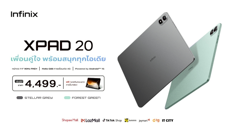 Infinix XPAD 20 เหมาะสำหรับนักเรียน นักศึกษา หรือผู้ที่ต้องการแท็บเล็ตคุณภาพในราคาคุ้มค่า เพื่อมอบความบันเทิง ตอบโจทย์การเรียน และทำงานได้อย่างครอบคลุม วางจำหน่ายแล้ววันนี้ ในราคาสุดคุ้มเพียง 4,499 บาท ทางช่องทางออนไลน์และร้านค้าชั้นนำทั่วประเทศ พร้อม 2 สีสันให้เลือก ได้แก่ Stellar Grey (เทา) และ Forest Green (เขียว)