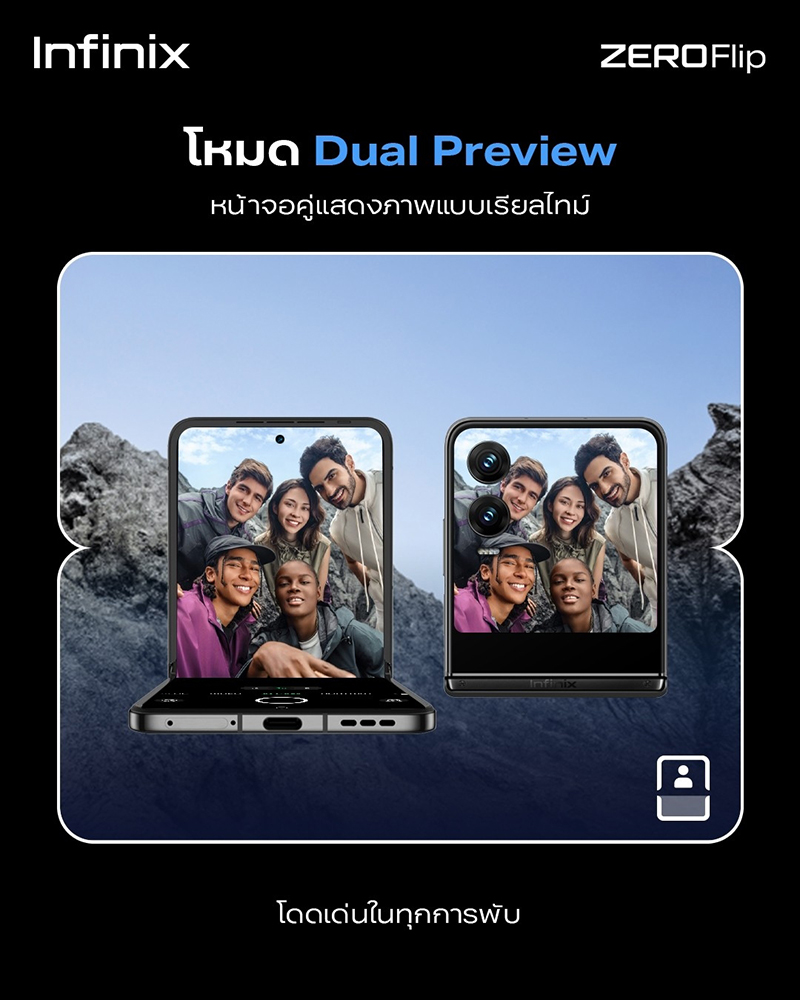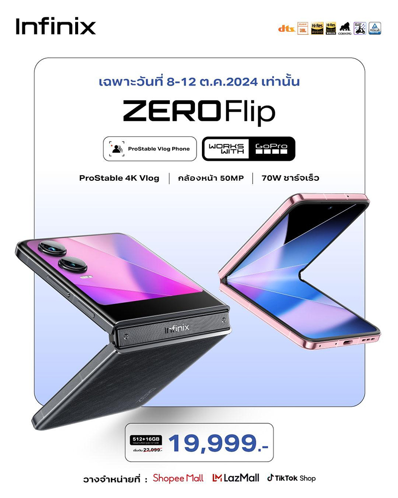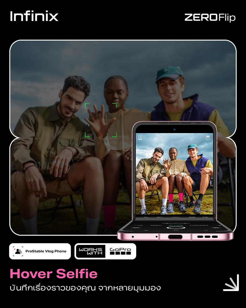 อินฟินิกซ์ (Infinix) แบรนด์สมาร์ทโฟนระดับโลกที่คุ้มค่า ครบครันทุกการใช้งาน และตอบโจทย์ไลฟ์สไตล์คนรุ่นใหม่ เปิดตัวสมาร์ทโฟนจอพับรุ่นแรกกับ ‘Infinix ZERO Flip’ ที่มาพร้อมกับกล้องบันทึกวิดีโอความคมชัดระดับ 4K ทั้งกล้องหน้าและกล้องหลัง พร้อมฟีเจอร์ ProStable รองรับการกันสั่น มีการรองรับการเชื่อมต่อกับ GoPro และความทนทานของแบตเตอรีที่ช่วยยืดอายุการใช้งานให้ยาวนานยิ่งขึ้น กับดีไซน์หน้าจอแบบ Dynamic MultiView ที่ให้ผู้ใช้งานสามารถปรับแต่งหน้าจอได้อย่างอิสระ พร้อมรองรับการใช้งานได้หลากหลายแอปพลิเคชัน รวมถึงสีสันสุดพิเศษที่ออกแบบโดย WGSN (World Global Style Network) ผู้นำด้านการคาดการณ์เทรนด์ระดับโลก อีกทั้งมอบประสบการณ์การใช้งานที่เหนือระดับ ด้วยการผสมผสานความคิดสร้างสรรค์และเทคโนโลยีที่ล้ำสมัย สะท้อนถึงความมุ่งมั่นของอินฟินิกซ์ที่จะมอบเทคโนโลยีสุดล้ำและเพื่อตอบโจทย์ไลฟ์สไตล์ของผู้บริโภคยุคใหม่