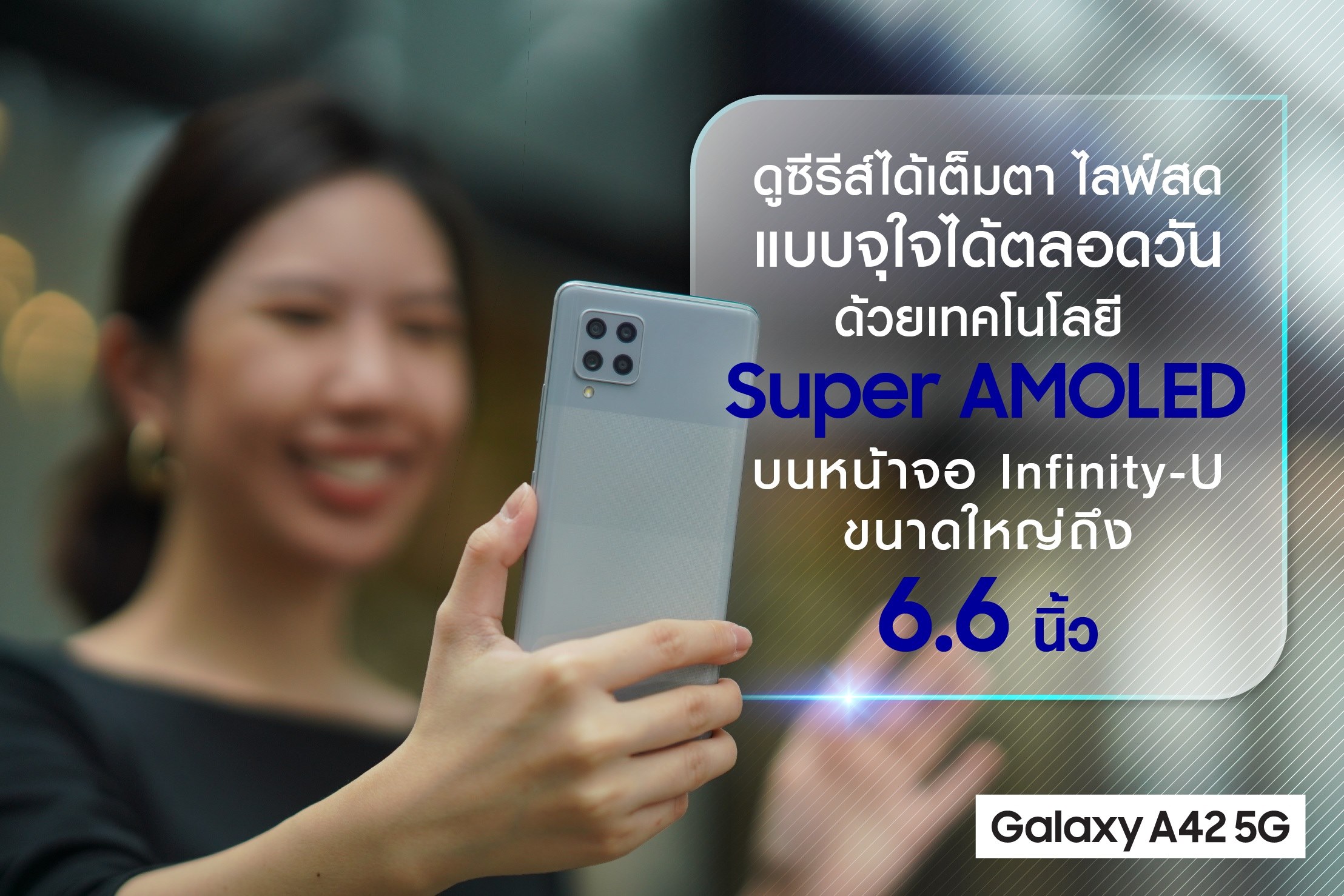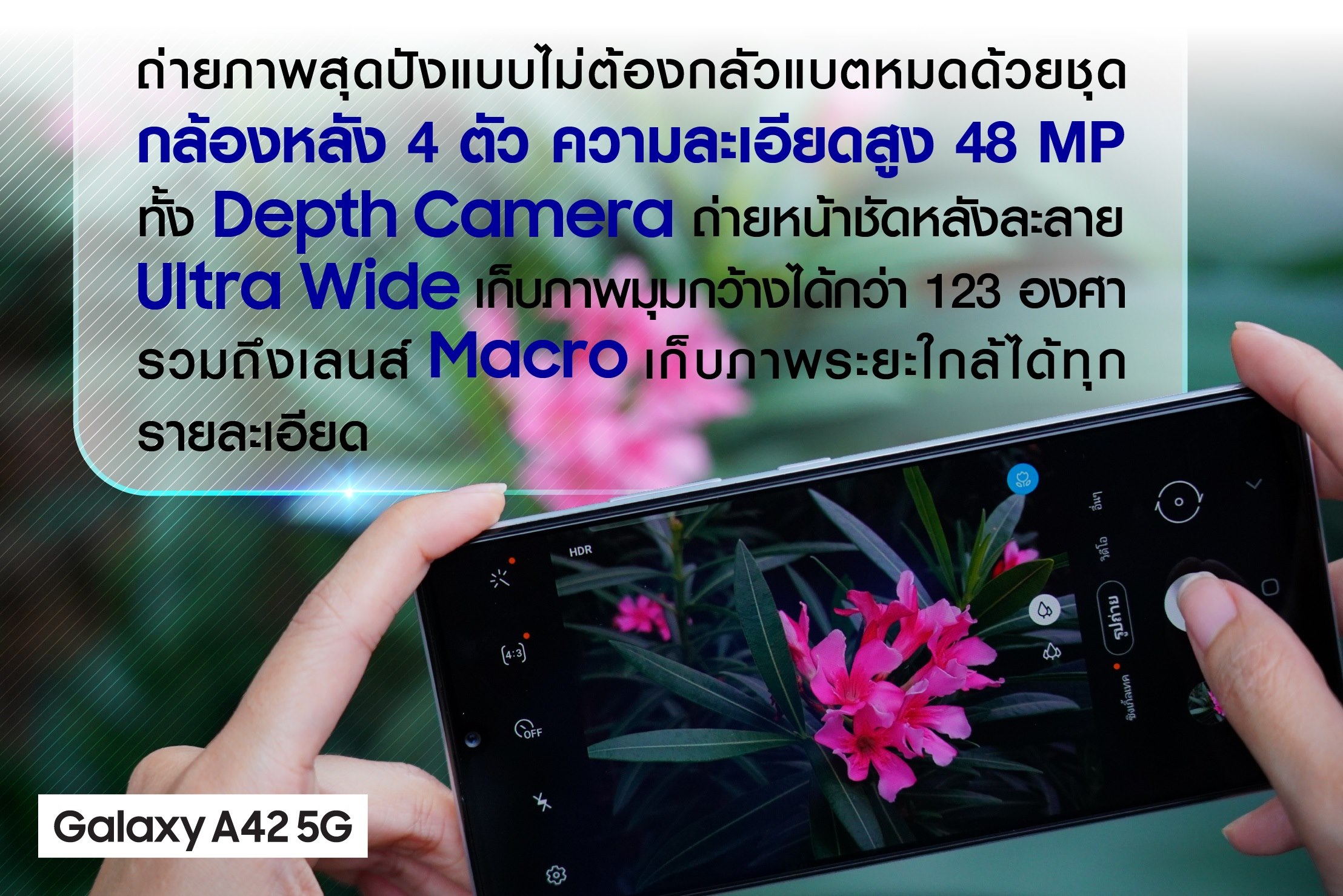 หมดกังวลเรื่องแบตหมดระหว่างเก็บภาพความทรงจำสุดพิเศษ เพราะ Galaxy A42 5G สามารถช่วยให้คุณเก็บทั้งภาพถ่ายและวิดีโอได้ต่อเนื่องยาวนานผ่านกล้องหลังความละเอียดสูงถึง 48 ล้านพิกเซล อีกทั้งยังโดดเด่นด้วย Depth Camera ที่ให้ภาพหน้าชัดหลังละลาย พร้อมเก็บภาพมุมกว้าง 123 องศาด้วยเลนส์ Ultra-Wide รวมถึงเลนส์ Macro ในการเก็บภาพระยะใกล้ได้สวยงาม เท่านั้นยังไม่พอ! ผู้ใช้ Galaxy A42 5G ยังได้รับสิทธิพิเศษอื่นๆ อีกมากมาย อาทิ สิทธิ์การใช้งาน YouTube Premium ฟรี 2 เดือน เมื่อลงทะเบียน[1] รวมถึงสิทธิประโยชน์พิเศษจาก Galaxy Gift พร้อมบริการช่วยเหลือพิเศษ Galaxy Butler Blue สามารถจองคิวเข้ารับบริการที่ศูนย์ล่วงหน้าได้ผ่านแอปพลิเคชัน Samsung Members พร้อมบริการเครื่องสำรองระหว่างรอการซ่อม