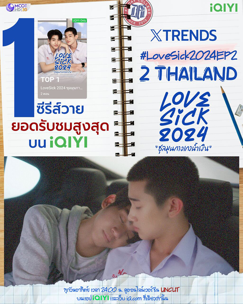 “LoveSick 2024 ชุลมุนกางเกงน้ำเงิน” ซีรีส์วายมาแรงยอดรับชมสูงสุดอันดับ 1 บน iQIYI พร้อมขึ้นเทรนด์ X อันดับ 2 ประเทศไทย