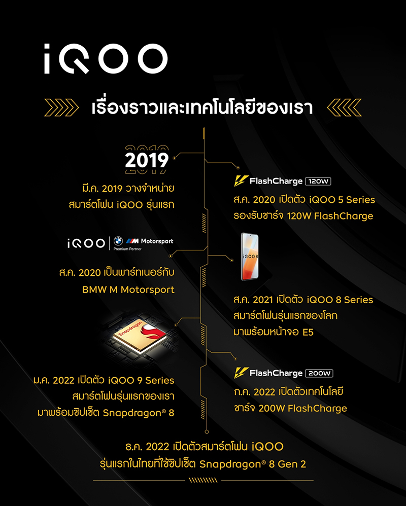 iQOO ยังผงาดขึ้นเป็นสมาร์ตโฟนผู้บุกเบิกเทคโนโลยี 5G รายแรก ๆ ในตลาดเมื่อแบรนด์ปล่อยรุ่น iQOO Pro 5G สมาร์ตโฟน 5G รุ่นเรือธงในเดือนสิงหาคมปี 2019 ก่อนเดินหน้าผนึกกำลังเป็นพันธมิตรระดับโลกให้กับ แบรนด์รถยนต์ยักษ์ใหญ่ BMW M Motorsport ในเดือนสิงหาคมปี 2020 iQOO ยังขับเคลื่อนวงการอีสปอร์ตในฐานะผู้สนับสนุน EDG e-sports club ชูขุมพลังสเปกโหดเพื่อเหล่านักกีฬาเกมเมอร์เมื่อต้นปี 2022 ที่ผ่านมา พร้อมปล่อยสมาร์ตโฟนรุ่น 9 series ที่เป็นรุ่นเรือธงรุ่นแรกที่มาพร้อมชิป Snapdragon 8 Gen 1 เรียกเสียงฮือฮาจากเหล่าคนรักสมาร์ตโฟนสเปกแรงได้ไม่น้อย แถมแบรนด์ยังขึ้นแท่น Top 3 แบรนด์สมาร์ตโฟน Online Brand Gaming Mindset และ Online Brand Performance Mindset การันตีสุดยอดแบรนด์แห่งวงการเกมมิงที่มาพร้อมประสิทธิภาพการใช้งานอันทรงพลัง