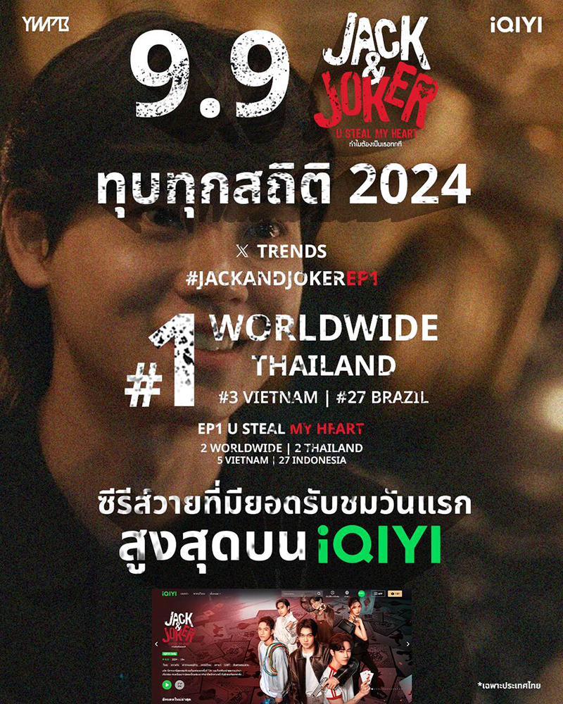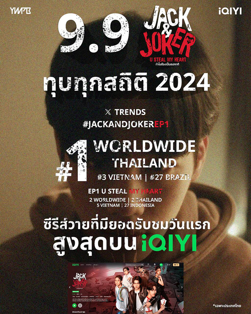 ทุบสถิติทุกช่องทางโซเชียล สร้างปรากฏการณ์ครองเทรนด์ X อันดับ 1 Worldwide กับ “JACK & JOKER U STEAL MY HEART ทำไมต้องเป็นเธอทุกที” สุดยอดซีรีส์วายมาแรงแห่งปี เจ้าของสถิติยอดชมวันแรกสูงที่สุดบนแอป iQIYI (อ้ายฉีอี้)