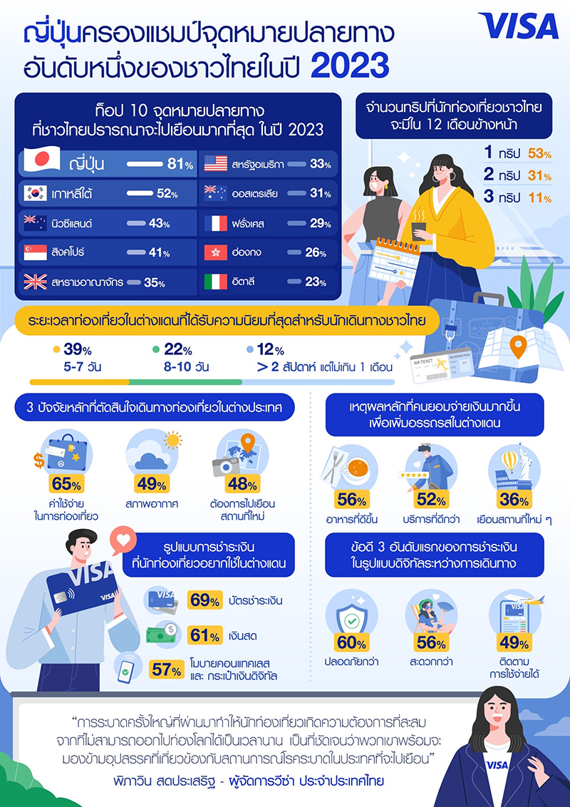วีซ่า ผู้นำการให้บริการการชำระเงินดิจิทัลระดับโลก เผยผลสำรวจเทรนด์การท่องเที่ยวต่างประเทศของนักเดินทางชาวไทยสำหรับปี 2023* (Thailand’s Travel Intentions Study 2023 – Outbound Edition) ว่าจุดหมายปลายทางห้าอันดับแรกที่นักเดินทางชาวไทยปรารถนาจะไปเยือนมากที่สุดได้แก่ประเทศญี่ปุ่น เกาหลีใต้ นิวซีแลนด์ สิงคโปร์ และสหราชอาณาจักร