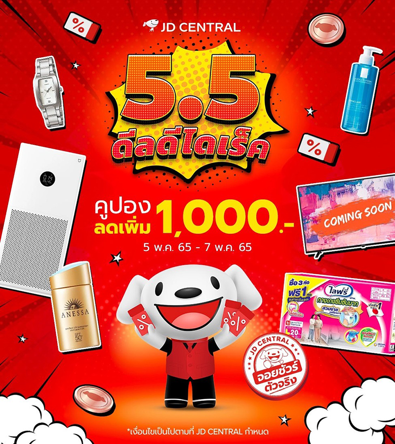 เจดี เซ็นทรัล (JD CENTRAL) ผู้นำด้านเทคโนโลยีอีคอมเมิร์ซและธุรกิจค้าปลีกในประเทศไทย ชวนมาหัวเราะ ห้า ห้า กับโปรฯเดือนห้า อย่าง ‘5.5 ดีลดีไดเร็ค’ แคมเปญช้อปคลายเครียด กับสินค้าราคา ว้าว ว้าว รับประกันความคุ้มค่า ถูกจริงไม่จกตา ช้อปแบบขำๆ แต่ได้ของแบบคุ้มๆ ลดสูงสุดกว่า 80% โดยเหล่านักช้อปสามารถเพลิดเพลินบันเทิงใจกับดีลพิเศษ ราคาขำๆที่พร้อมส่งตรงถึงมือได้แล้ว ตั้งแต่วันที่ 5 พ.ค. 65 – 7 พ.ค. 65 เท่านั้น!