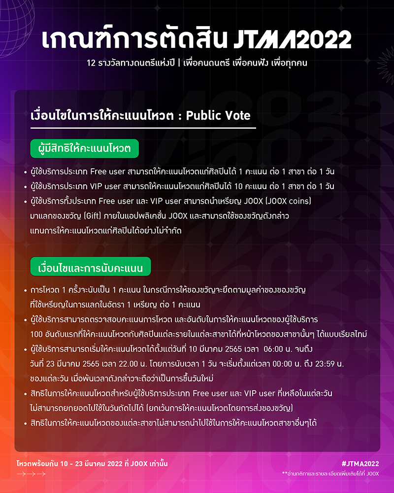 ด้อมไหน แฟนคลับใคร มาโหวตเพื่อให้กำลังใจศิลปินที่ชื่นชอบกันได้แล้วตั้งแต่วันที่ 10 – 23 มีนาคมนี้ ผ่านทาง JOOX Music Application และเว็บไซต์ www.joox.com โดยผู้ใช้บริการประเภท Free user สามารถโหวตได้ 1 คะแนน ต่อ 1 สาขา ต่อ 1 วัน ผู้ใช้บริการ JOOX VIP สามารถโหวตได้ 10 คะแนน ต่อ 1 สาขา ต่อ 1 วัน นอกจากนี้ผู้ใช้งานสามารถนำเหรียญ JOOX (JOOX coins) มาแลกของขวัญ (Gift) เพื่อเปลี่ยนเป็นคะแนนให้ศิลปินได้อย่างไม่จำกัดอีกด้วย (1 coin = 1 คะแนนโหวต)