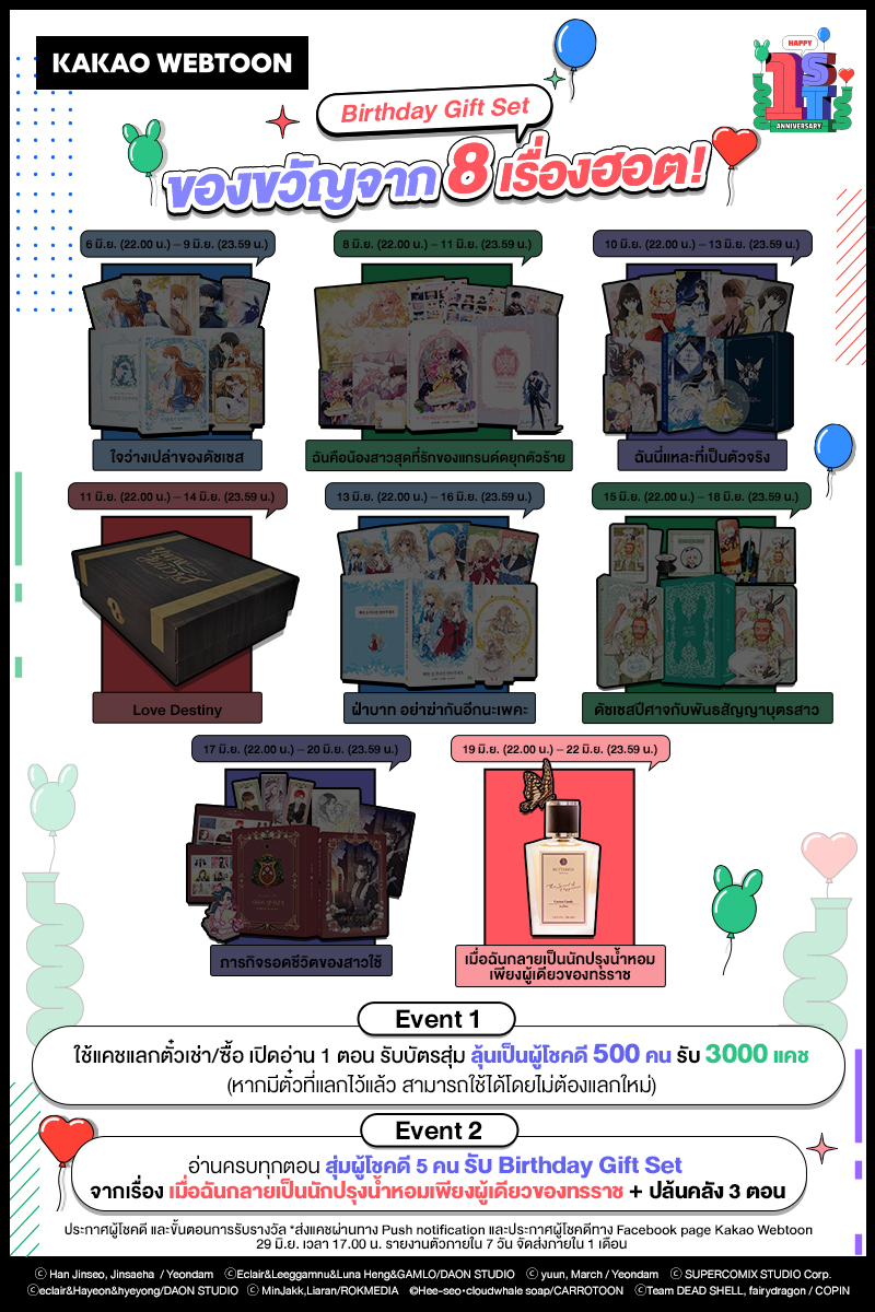 กิจกรรมที่ 4 “Birthday Gift Set ของขวัญจาก 8 เรื่องฮอต!” ร่วมสนุกแบบ 2 ต่อ ต่อที่หนึ่ง เพียงใช้แคชแลกตั๋วเช่า หรือตั๋วซื้อเปิดอ่านการ์ตูนตามเรื่องและวันที่กำหนด “เปิดอ่าน 1 ตอน” รับทันทีบัตรสุ่ม 10 ใบ เพื่อลุ้นเป็น 500 ผู้โชคดี รับ 3,000 แคชฟรี!! (หากมีตั๋วที่แลกไว้แล้วในช่วงกิจกรรมเดือนเกิด สามารถใช้ได้โดยไม่ต้องแลกใหม่) ต่อที่สอง “อ่านครบทุกตอน” ลุ้นเป็นหนึ่งในผู้โชคดีที่จะได้รับ Birthday Gift Set จากเรื่องที่อ่าน อาทิ เซตโปสเตอร์ กล่องของขวัญ Love Destiny หรือ น้ำหอมจาก Butterfly Thai Perfume โดยสามารถติดตามไลน์อัพเรื่องที่ร่วมสนุกได้ที่ Facebook : KAKAO WEBTOON Thailand ระยะเวลาร่วมสนุกตั้งแต่วันที่ 6-22 มิถุนายน ประกาศผลผู้โชคดีวันที่ 29 มิถุนายน เวลา 17.00 น.