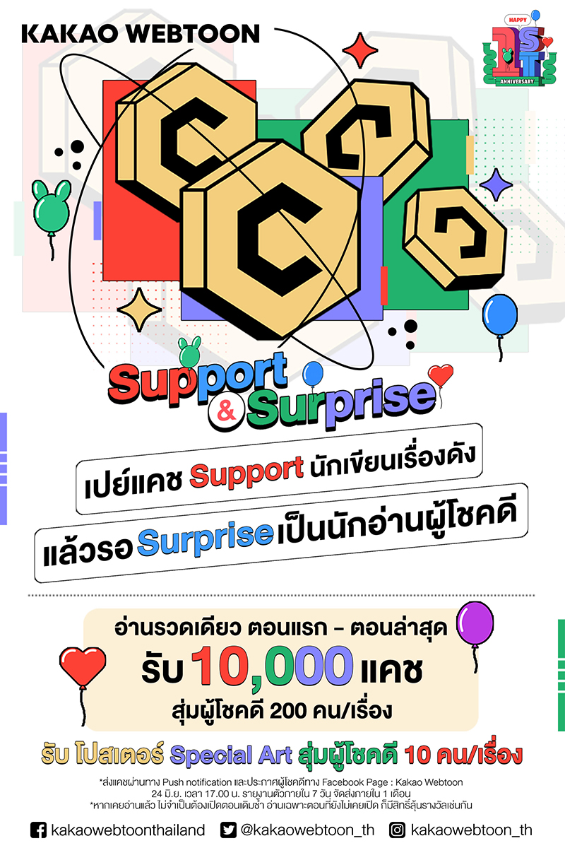 กิจกรรมที่ 3 “Support & Surprise เปย์แคช Support นักเขียนเรื่องดัง แล้วรอ Surprise เป็นนักอ่านผู้โชคดี” ท้าคอ เว็บตูนมาอ่านเรื่องดังแบบรัวๆ เพื่อลุ้นรับแคชและของขวัญสุดปัง เพียงอ่านเรื่องดังที่กำหนดรวดเดียวตั้งแต่ตอนแรกถึงตอนล่าสุด ก็มีสิทธิ์ลุ้นเป็นผู้โชคดี รับ 10,000 แคช สุ่มแจก 200 คนต่อเรื่อง และลุ้นรับโปสเตอร์ Special Art สุ่มแจก 10 คนต่อเรื่องเท่านั้น โดยสามารถติดตามไลน์อัพเรื่องที่ร่วมสนุกได้ที่ Facebook : KAKAO WEBTOON Thailand ระยะเวลาร่วมสนุกตั้งแต่วันที่ 10-18 มิถุนายน ประกาศผลผู้โชคดีวันที่ 24 มิถุนายน เวลา 17.00 น.