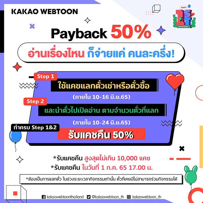 สนุกจัดเต็มกันไปเลย!! ‘คาเคา เว็บตูน ไทยแลนด์’ (KAKAO WEBTOON Thailand) ผู้ให้บริการแพลตฟอร์มคอนเทนต์และเคเว็บตูนชั้นนำของเกาหลี ฉลองครอบรอบ 1 ปีในไทย ส่ง 4 กิจกรรมแจกจุกจุก ขอบคุณแฟนๆ และนักอ่านที่อยู่ด้วยกันมาตลอดปี จัดหนักทั้งลดราคา เปย์แคช และลุ้นรับกิฟท์เซตสุด เอ็กซ์คลูซีฟจากการ์ตูนเรื่องดัง มาร่วมสนุกไปกับเดือนครบรอบกันได้แล้วตลอดทั้งเดือนมิถุนายนนี้ สาวก KAKAO WEBTOON Thailand และคอเว็บตูนห้ามพลาด!! ติดตามรายละเอียดเพิ่มเติมได้ที่ Facebook : KAKAO WEBTOON Thailand Instagram : kakaowebtoon_th และ Twitter : @ kakaowebtoon_th