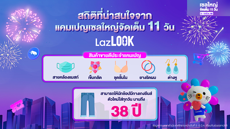 - จากแคมเปญเซลใหญ่จัดเต็ม 11 วัน ในช่วงวันที่ 3 – 13 มีนาคมที่ผ่านมา สินค้าจาก LazLOOK-LazBEAUTY บนลาซาด้ายังคงได้รับความนิยมสูงสุดในหมู่นักช้อปชาวไทย
