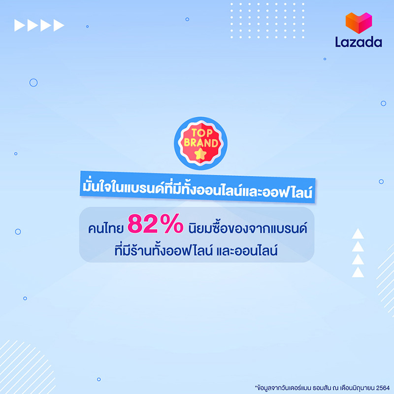 - มั่นใจในแบรนด์ที่มีทั้งออนไลน์และออฟไลน์ จากรายงาน Future Shopper 2021 ของวันเดอร์แมน ธอมสัน คนไทย 82% นิยมซื้อของจากแบรนด์ที่มีร้านทั้งออฟไลน์และออนไลน์ การมีร้านทั้งสองช่องทางจะช่วยให้แบรนด์ชนะใจผู้บริโภคง่ายขึ้น โดยเฉพาะการขยายไปอีคอมเมิร์ซ ซึ่งช่วยให้สามารถเข้าถึงนักช้อปได้ทั่วประเทศ โดยที่ผ่านมา หลายแบรนด์ประสบความสำเร็จในการเข้าถึงผู้บริโภคจากการเปิดร้านบน LazMall ปัจจุบัน ลาซาด้ามีแบรนด์บน LazMall มากกว่า 9,000 แบรนด์ เพิ่มขึ้น 350% จากปี 2563