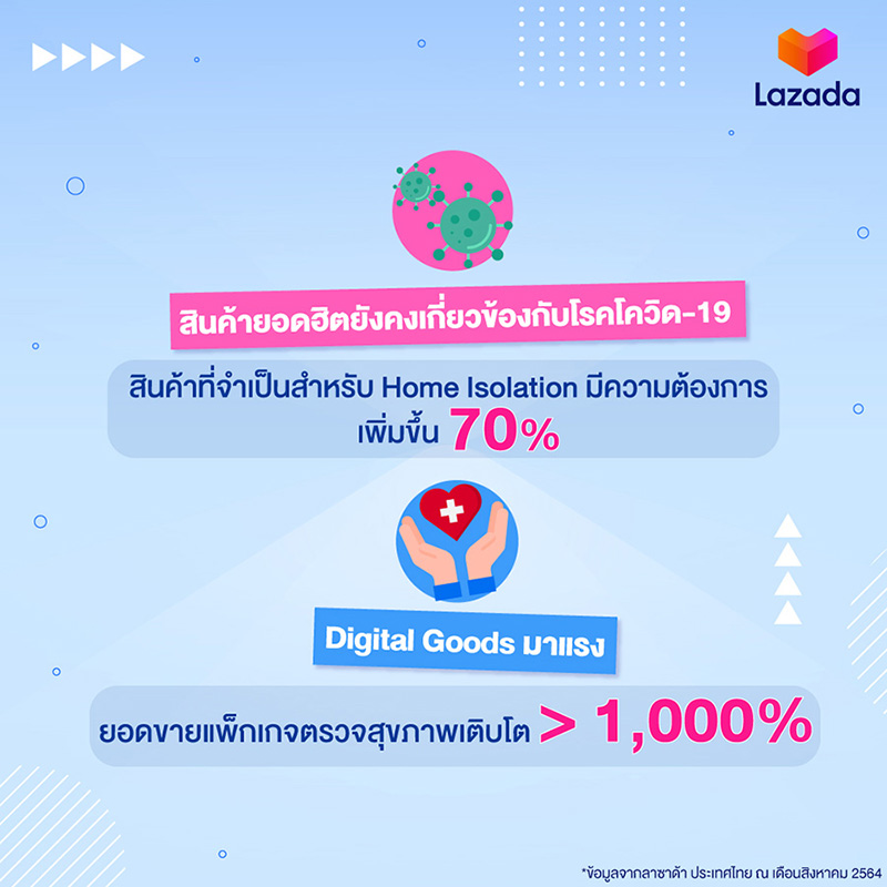 - สินค้ายอดฮิตยังคงเกี่ยวข้องกับโรคโควิด-19 รวมไปถึงอุปกรณ์ที่จำเป็นสำหรับการทำ Home Isolation เช่น หน้ากากอนามัย เจลแอลกอฮอล์ เทอร์โมมิเตอร์วัดอุณหภูมิ เครื่องวัดออกซิเจนจากปลายนิ้ว ถุงขยะสีแดงมีหูผูกสำหรับขยะติดเชื้อ เป็นต้น โดยตั้งแต่เดือนมิถุนายนที่ผ่านมา สินค้าในกลุ่มเหล่านี้มีความต้องการเพิ่มมากถึง 70%