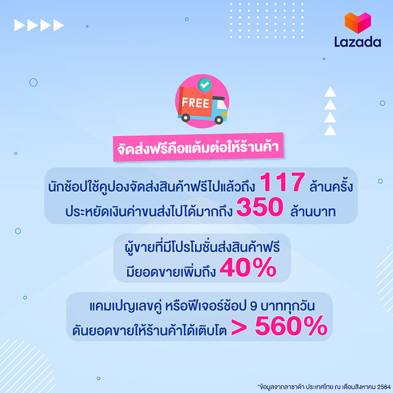 - นักช้อปคาดหวังในบริการด้านการจัดส่งมากขึ้น การจัดส่งสินค้าฟรีจึงเป็นแต้มต่อให้กับร้านค้า ตั้งแต่ต้นปีที่ผ่านมา นักช้อปใช้คูปองจัดส่งสินค้าฟรีบนแอปฯ ลาซาด้าไปแล้วถึง 117 ล้านครั้ง ช่วยผู้บริโภคประหยัดเงินค่าขนส่งไปได้มากถึง 350 ล้านบาท ส่วนผู้ขายที่มีโปรโมชั่นส่งสินค้าฟรีพบว่ามียอดขายเพิ่มมากขึ้นถึง 40% นอกจากนี้ โครงการอื่นๆ ของลาซาด้า เช่น แคมเปญเลขคู่ หรือฟีเจอร์ช้อป 9 บาททุกวัน ก็ช่วยดันยอดขายให้ร้านค้าได้เติบโต 560% ลาซาด้าจึงจัดโปรโมชั่นส่งสินค้าฟรีในแคมเปญต่างๆ อย่างต่อเนื่อง รวมถึงแคมเปญ 9 Mega Brands Sale เมกะแคมเปญที่จะมาถึงในเดือนกันยายนนี้ พร้อมระบบลาซาด้าโลจิสติกส์ที่รวดเร็วและครอบคลุมเพื่อช่วยผู้ขายตอบสนองความต้องการของผู้บริโภคและสนับสนุนให้คนไทยก้าวผ่านช่วงเวลาที่ท้าทายนี้ไปด้วยกัน
