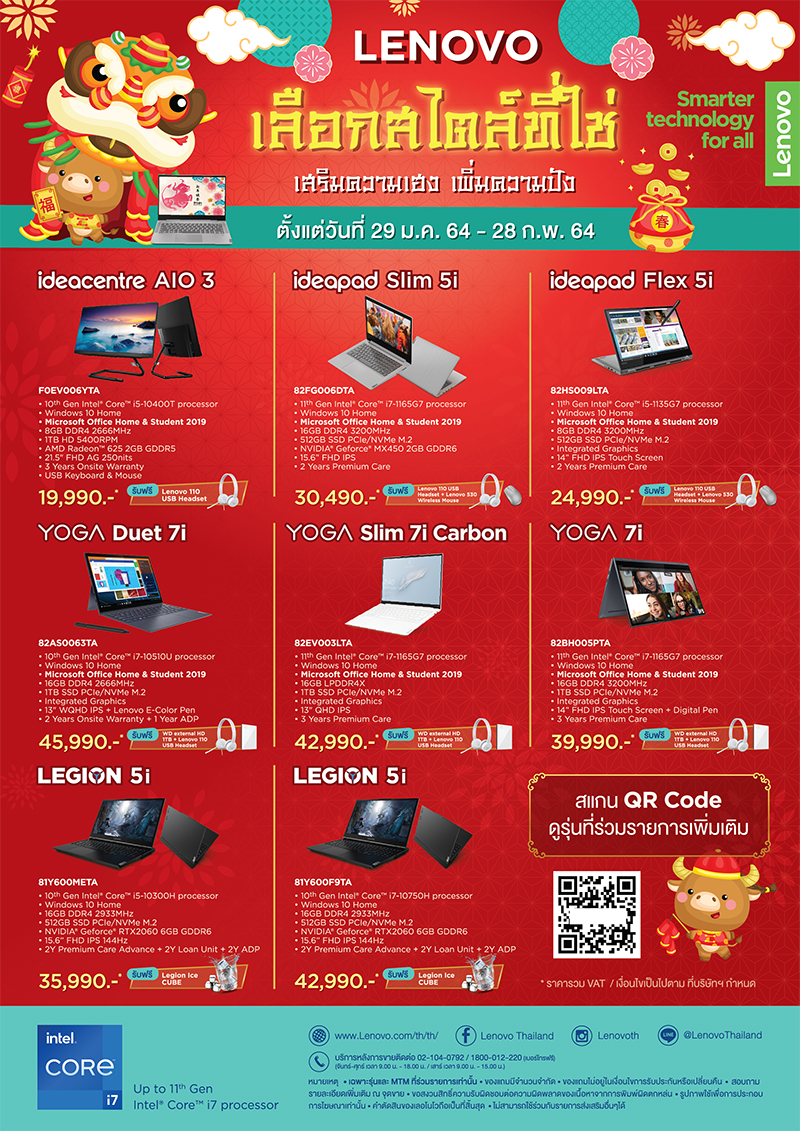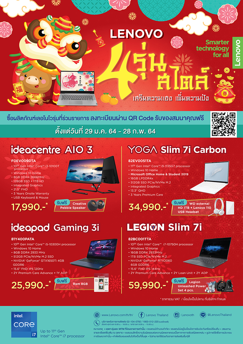Lenovo บริษัทผู้นำด้านคอมพิวเตอร์ และสมาร์ทดีไวซ์ระดับโลก ต้อนรับเทศกาลตรุษจีนฉลองปีวัว 2564 จัดแคมเปญโปรโมชั่นผลิตภัณฑ์แล็ปท็อป และคอมพิวเตอร์เดกส์ท็อป 4 ไลน์ผลิตภัณฑ์ ไม่ว่าจะเป็น Lenovo Yoga, Lenovo Legion, Lenovo IdeaPad และ Lenovo IdeaCentre เพื่อตอบโจทย์ผู้ที่กำลังมองหาผลิตภัณฑ์คอมพิวเตอร์ฟังก์ชันครบครัน ภายใต้สไตล์และวัตถุประสงค์การใช้งานที่แตกต่างกันออกไป นอกจากนี้ยังเตรียมแจกอั่งเปาของแถมสุดพรีเมี่ยม อาทิ หูฟัง และเมาส์ไร้สายจากเลอโนโว, ฮาร์ดดิสก์พกพา, Ram, ลำโพงแบบพกพา เมื่อสแกนคิวอาร์โค้ดลงทะเบียน โดยโปรโมชั่นเริ่มแล้ว วันนี้ – 28 กุมภาพันธ์ 2564