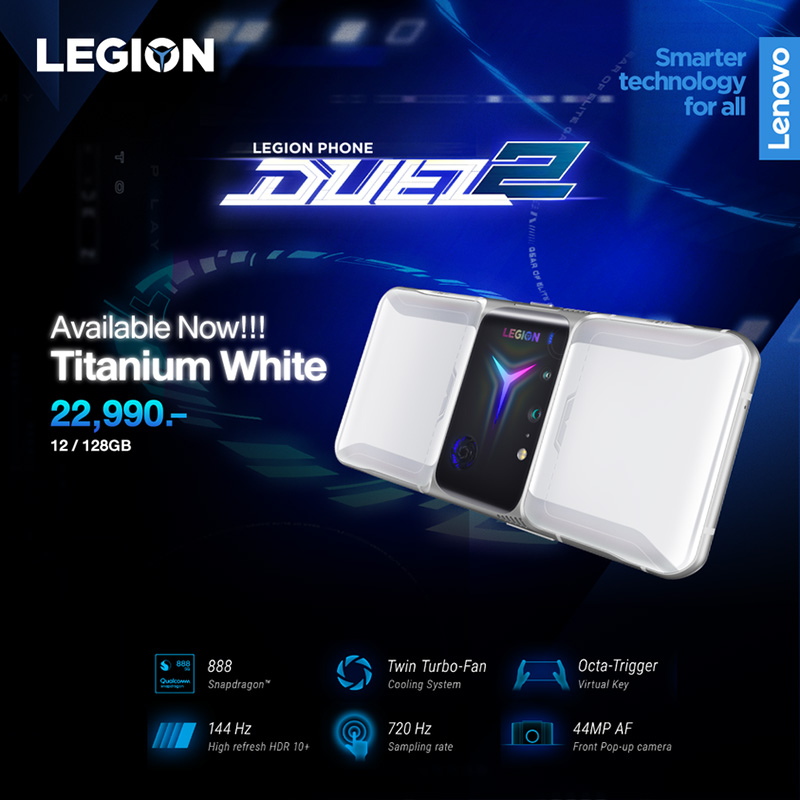 ใหม่ล่าสุดกับเฉดสีขาว Titanium White บนเกมมิ่งสมาร์ทโฟน Legion Phone Duel 2 ที่มาพร้อมชิปประมวลผล Snapdragon™ 888 5G Mobile Platform เทคโนโลยี 5NM พร้อมให้ เกมเมอร์ไทยได้เป็นเจ้าของแล้ววันนี้