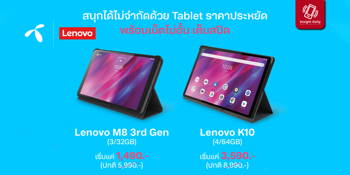 - Lenovo Tab M8 3rd Gen (3/32GB) ราคาพิเศษเพียง 1,490.- บาท (จากราคาปกติ 5,990.-) ราคาโปรโมชั่นเมื่อสมัครแพ็คเกจ DTAC – บาทเท่านั้น