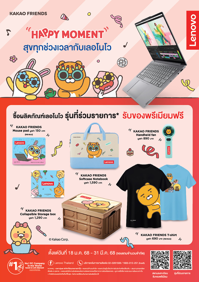 เลอโนโว ประเทศไทย ต้อนรับปี 2025 กับแคมเปญ “Happy Moment with Lenovo” มอบของขวัญสุดพิเศษ ให้ลูกค้าเลอโนโวและแฟน ๆ แก๊งค์ Kakao Friends ได้เป็นเจ้าของคอลเลกชันสุดเอ็กซ์คลูซีฟไว้สะสมได้ฟรีทันทีเมื่อซื้อผลิตภัณฑ์เลอโนโวที่ร่วมรายการ ตั้งแต่วันที่ 18 มกราคม – 31 มีนาคม 2568 – เลอโนโว พัฒนาและออกแบบนวัตกรรมอุปกรณ์อัจฉริยะเพื่อยกระดับประสบการณ์เพื่อการใช้งานในชีวิตประจำวันสำหรับทุกคน ตั้งแต่การทำงานได้อย่างราบรื่น ไปจนถึงการเล่นเกมสุดโปรด