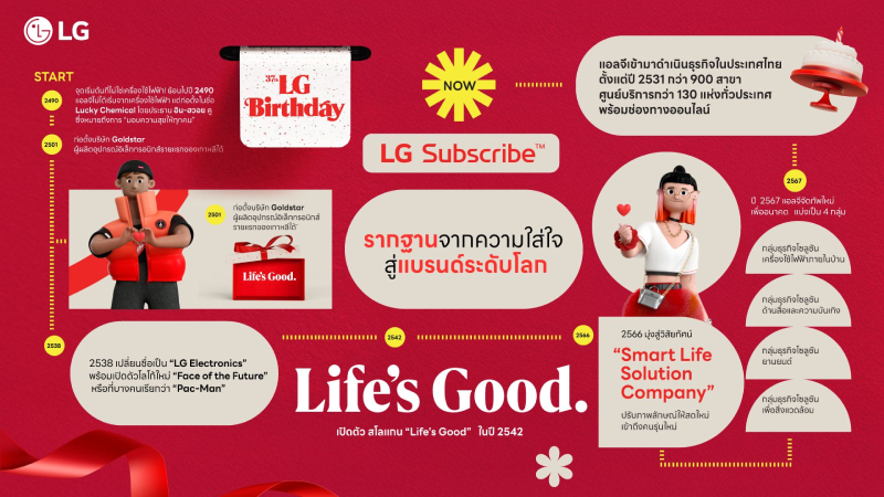 - เปิดตัว สโลแกน“Life’s Good” ในปี 2542 และกลายเป็นที่รู้จักไปทั่วโลก ถือเป็นสัญลักษณ์ของความมุ่งมั่นในการสร้างสรรค์นวัตกรรมเพื่อคุณภาพชีวิตที่ดีขึ้น