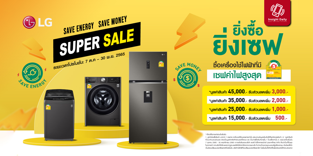 ด้วยความมุ่งมั่นในการสนับสนุนให้คนไทยหันมาใช้พลังงานไฟฟ้าอย่างคุ้มค่า เพื่อช่วยประหยัดค่าไฟและลดผลกระทบต่อสิ่งแวดล้อม บริษัท แอลจี อีเลคทรอนิคส์ (ประเทศไทย) จำกัด ผู้นำด้านการพัฒนานวัตกรรมเครื่องใช้ไฟฟ้าภายในบ้าน ส่งโปรโมชั่น “Super Sale ยิ่งซื้อ ยิ่งเซฟ” มอบส่วนลดพิเศษสูงสุด 3,000 บาท เมื่อซื้อผลิตภัณฑ์เครื่องซักผ้าหรือตู้เย็นที่เข้าร่วมรายการจากแอลจี ที่ได้รับการรับรองมาตรฐานด้านการประหยัดพลังงานจากฉลากประหยัดไฟฟ้าเบอร์ 5 ระดับ 3 ดาว ซึ่งเป็นระดับประหยัดพลังงานที่มีประสิทธิภาพสูงสุด ตั้งแต่วันที่ 7 ตุลาคม จนถึง 30 พฤศจิกายน พ.ศ. 2565 ณ ห้างสรรพสินค้าชั้นนำหรือตัวแทนจำหน่ายของแอลจีทั่วประเทศ