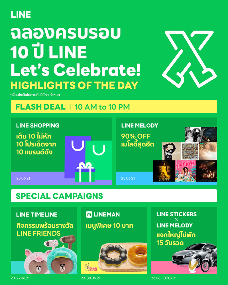 LINE ฉลองครบรอบ 10 ปี กับการเป็นแพลตฟอร์มเพื่อชีวิตยุคดิจิทัล ส่งพาเหรดกิจกรรมและโปรโมชันสุดฮอตแห่งปีที่ไม่ได้มีกันบ่อยๆ ชวนผู้ใช้ LINE หยิบมือถือเตรียมคว้าดีลแห่งปีที่ต้องห้ามพลาด ที่คราวนี้มาพร้อมกับ 4 โปรโมชันกับอีก 1 กิจกรรม จาก 5 บริการยอดฮิตของ LINE ทั้ง LINE STICKERS, LINE MELODY, LINE SHOPPING, LINE MAN และ LINE TIMELINE พร้อมลุ้นรางวัลรวมมูลค่ากว่าล้านบาท เริ่ม 23 มิ.ย. นี้