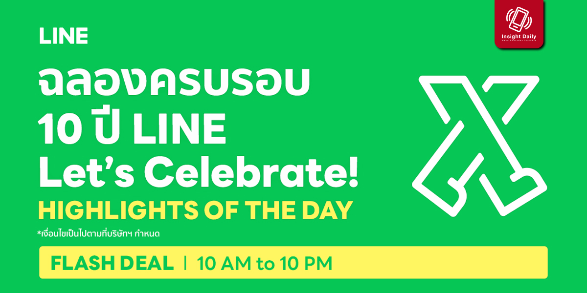 LINE ฉลองครบรอบ 10 ปี กับการเป็นแพลตฟอร์มเพื่อชีวิตยุคดิจิทัล ส่งพาเหรดกิจกรรมและโปรโมชันสุดฮอตแห่งปีที่ไม่ได้มีกันบ่อยๆ ชวนผู้ใช้ LINE หยิบมือถือเตรียมคว้าดีลแห่งปีที่ต้องห้ามพลาด ที่คราวนี้มาพร้อมกับ 4 โปรโมชันกับอีก 1 กิจกรรม จาก 5 บริการยอดฮิตของ LINE ทั้ง LINE STICKERS, LINE MELODY, LINE SHOPPING, LINE MAN และ LINE TIMELINE พร้อมลุ้นรางวัลรวมมูลค่ากว่าล้านบาท เริ่ม 23 มิ.ย. นี้