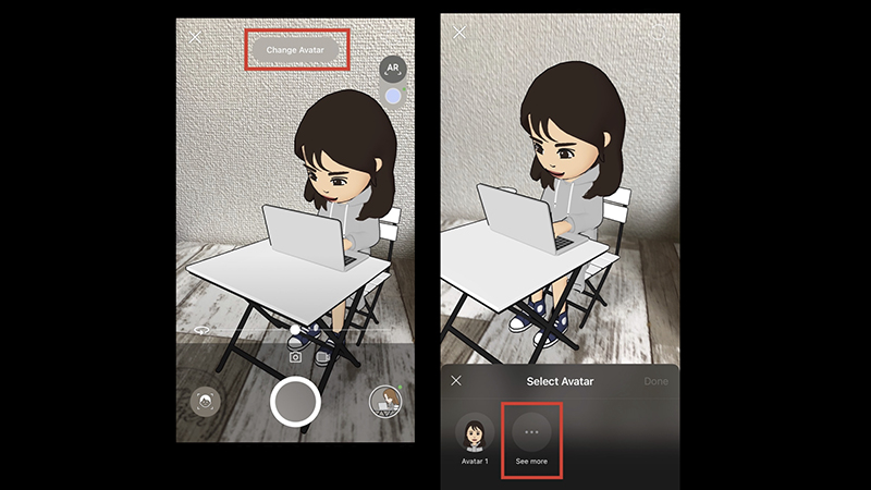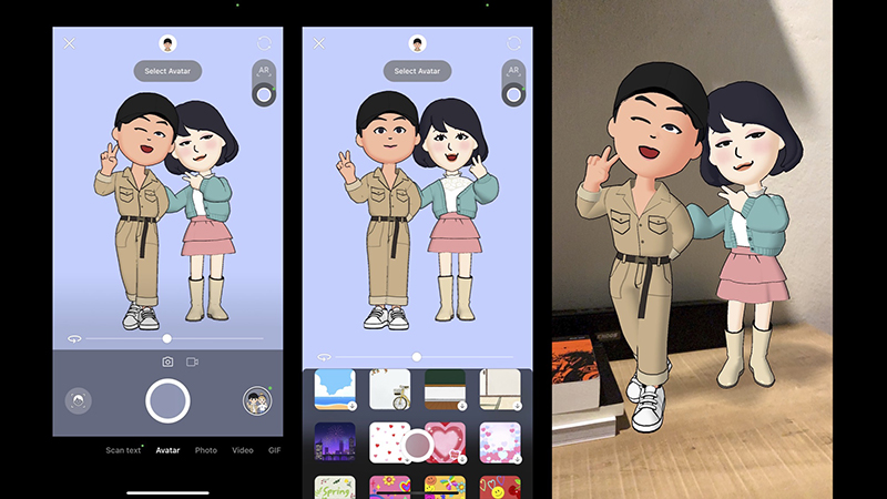 5. นำ Avatar ของเราและของเพื่อน มาถ่ายภาพร่วมเฟรม ด้วยท่าทางและกิจกรรมที่มีให้เลือกมากมาย สามารถวาง Avatar ไว้บนภาพนิ่งที่มีให้ ภาพที่เราไปเซฟมา หรือจะใช้โหมด AR ภาพเสมือนจริง วางตัว Avatar ไว้เบื้องหน้าเรา เพียงหมุนกล้องไปบนพื้นที่แบนราบ ตัว Avatar ของเราและเพื่อนก็จะปรากฏขึ้นเบื้องหน้าทันที โดยสามารถเซฟเป็นภาพนิ่งและภาพเคลื่อนไหวได้
