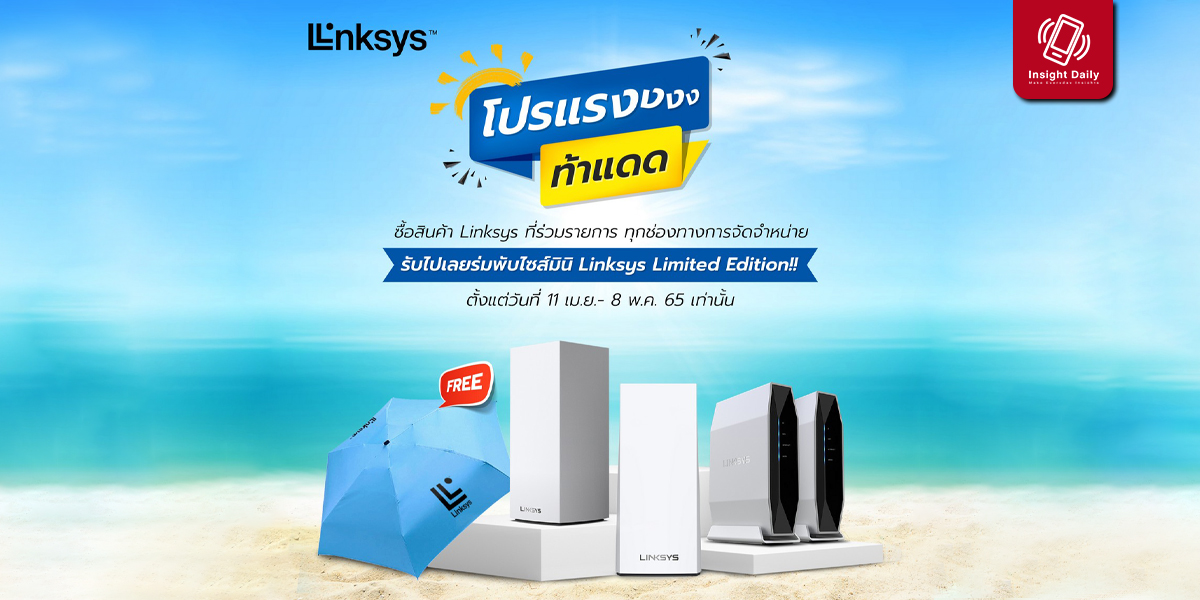 Linksys (ลิงค์ซิส) ผู้นำระดับโลกด้านอุปกรณ์เชื่อมต่อเครือข่ายไร้สายบรอดแบรนด์ จัดโปรโมชั่นรับช่วงสงกรานต์ด้วยแคมเปญ Linksys Summer Sale ให้ลูกค้าได้เป็นเจ้าของเราเตอร์ Linksys รุ่น Atlas Pro 6 ในราคาพิเศษสุดเริ่มต้นเพียง 4,590 บาท จากราคาปกติ 6,290 บาท พร้อมรับร่มสุดคูล Limited Edition ตั้งแต่วันที่ 12-16 เม.ย.นี้เท่านั้น