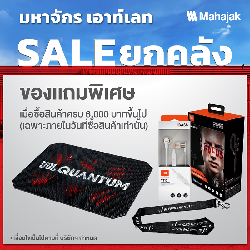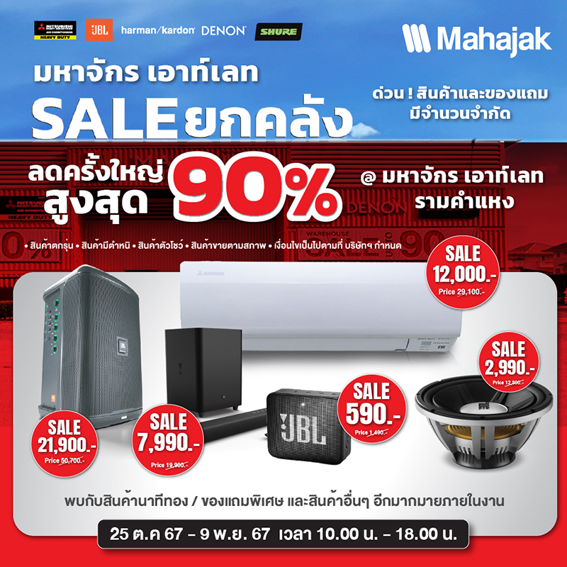 บริษัท มหาจักรดีเวลอปเมนท์ จำกัด จัดมหกรรมลดราคาครั้งใหญ่ที่สุดในรอบปี “Mahajak Outlet Sale ยกคลัง” ลดสูงสุดถึง 90% รวบรวมสินค้าแบรนด์ดังจากมหาจักรฯ ทั้ง ลำโพงพกพา, หูฟัง Lifestyle, เครื่องเสียงระดับมืออาชีพ Professional Audio, เครื่องเสียงบ้าน Home Audio, เครื่องเสียงติดรถยนต์ JBL Car Audio และเครื่องปรับอากาศ Mitsubishi Heavy Duty