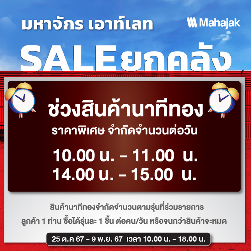 พบกับสินค้านาทีทอง ลดราคาพิเศษจำกัดจำนวนต่อวัน และสินค้าอื่นๆ อีกมากมายในงาน พร้อมของแถมสุดพิเศษ ฟรี! (เมื่อซื้อสินค้าตามเงื่อนไขที่กำหนดเฉพาะภายในวันที่ซื้อสินค้าเท่านั้น) ที่ Mahajak Outlet รามคำแหง วันที่ 25 ตุลาคม – 9 พฤศจิกายน 2567 เปิดให้บริการทุกวัน ตั้งแต่เวลา 10.00 น. – 18.00 น.