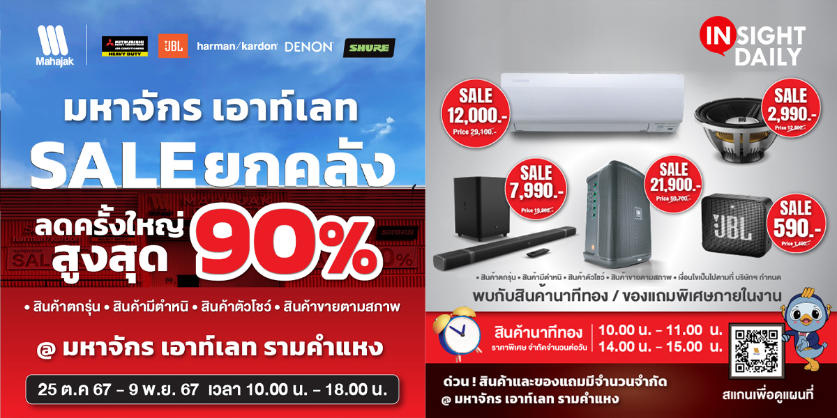 บริษัท มหาจักรดีเวลอปเมนท์ จำกัด จัดมหกรรมลดราคาครั้งใหญ่ที่สุดในรอบปี “Mahajak Outlet Sale ยกคลัง” ลดสูงสุดถึง 90% รวบรวมสินค้าแบรนด์ดังจากมหาจักรฯ ทั้ง ลำโพงพกพา, หูฟัง Lifestyle, เครื่องเสียงระดับมืออาชีพ Professional Audio, เครื่องเสียงบ้าน Home Audio, เครื่องเสียงติดรถยนต์ JBL Car Audio และเครื่องปรับอากาศ Mitsubishi Heavy Duty