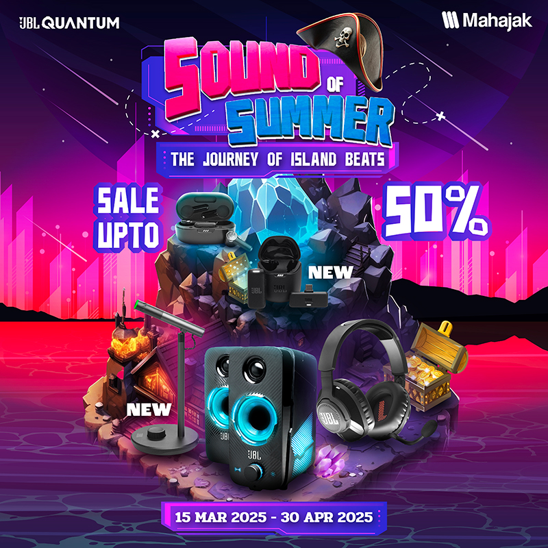 บริษัท มหาจักรดีเวลอปเมนท์ จำกัด จัดดีลสุดพิเศษรับหน้าร้อน กับ “Sound of Summer 2025” ปีนี้มาในธีม The Journey of Island Beats การเดินทางสุดลึกลับ ที่จะพาทุกคนไปตามหาขุมทรัพย์ไม่ว่าจะเป็น หูฟัง ลำโพง และไมค์ สุดเท่ที่เต็มไปด้วยคุณภาพ จาก JBL Quantum Series ลดสูงสุดถึง 50% โดยมีรายละเอียดดังนี้