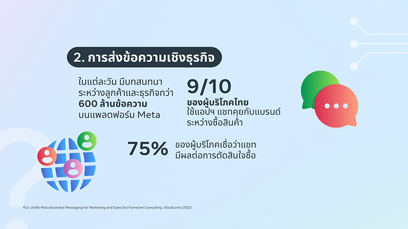 เทรนด์การสื่อสารกับธุรกิจผ่านข้อความเป็นหนึ่งในการเปลี่ยนแปลงที่เห็นได้ชัดที่สุด เมื่อพวกเขานิยมติดต่อกับธุรกิจผ่านแชทเช่นเดียวกับที่ติดต่อกับเพื่อนและครอบครัวมากขึ้น Meta พบว่าเทรนด์นี้เกิดขึ้นทั่วโลก โดยผู้คนมากกว่า 1 พันล้านคนพูดคุยกับแบรนด์หรือธุรกิจผ่าน Messenger, Instagram และ WhatsApp ทุกสัปดาห์ เห็นได้ชัดในเอเชียแปซิฟิก โดยผู้บริโภคอย่างน้อย 1 ใน 3 แชทกับธุรกิจสัปดาห์ละครั้ง ประเทศไทยก็เป็นหนึ่งในผู้นำในเทรนด์ โดย 9 ใน 10 ของผู้บริโภคชาวไทยสื่อสารกับธุรกิจผ่านแอปพลิเคชันแชทระหว่างการซื้อสินค้า และ 75% ของผู้บริโภคพิจารณาว่าการส่งข้อความทางธุรกิจมีผลกระทบอย่างมากต่อการตัดสินใจซื้อ
