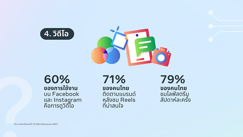 ผู้คนทั่วโลกกำลังบริโภคคอนเทนต์วิดีโอมากขึ้นเรื่อยๆ โดย Insider Intelligence คาดการณ์ว่าเวลาที่ใช้ในการรับชมโทรทัศน์และคอนเทนต์วิดีโอในปี 2025 จะมีเพิ่มขึ้น 15% ในภูมิภาคเอเชียแปซิฟิก ส่วนเวลาที่ใช้ในการดูวิดีโอบน Instagram และ Facebook ก็เพิ่มขึ้นเช่นกัน โดยจากข้อมูลของ Meta เผยว่า 60% ของเวลาที่ใช้บนทั้งสองแพลตฟอร์มถูกใช้ไปกับคอนเทนต์วิดีโอ เช่น Reels ซึ่งมีผลต่อการซื้อสินค้า โดยงานวิจัยล่าสุดเผยว่า สองในสามของผู้บริโภคในภูมิภาคเอเชียแปซิฟิกตัดสินใจซื้อสินค้าหลังจากดู Reels และ 71% ของผู้บริโภคในประเทศไทยติดตามแบรนด์หลังจากได้รับชม Reel ที่มีความน่าสนใจ