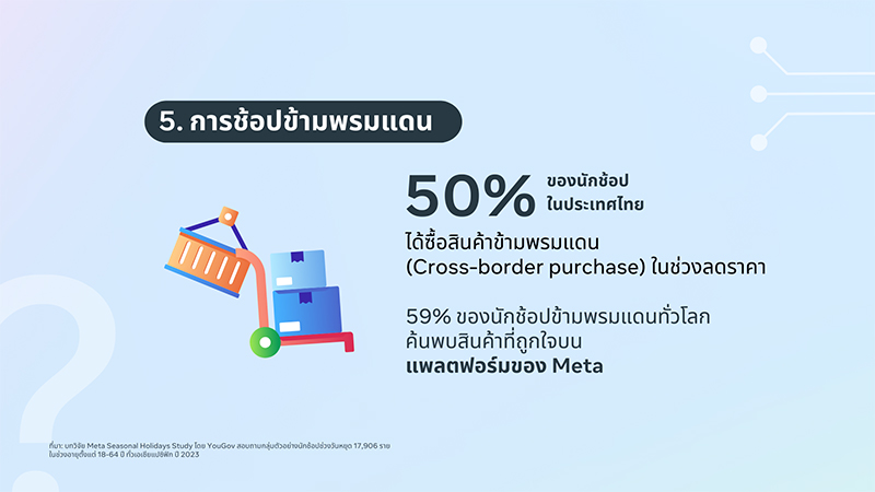 ในปัจจุบัน ผู้คนใช้เทคโนโลยีในการซื้อสินค้าจากทั่วโลกมากขึ้น เพื่อตอบสนองความต้องการตัวเลือกสินค้าที่หลากหลายยิ่งกว่าเดิม มีการคาดการณ์ว่าการค้าข้ามพรมแดน (Cross-Border Shopping) จะมีมูลค่า 3.3 ล้านล้านดอลลาร์สหรัฐภายในปี 2571 โดยการค้าข้ามพรมแดนออนไลน์จะช่วยผลักดันการเติบโตของธุรกิจมากกว่าการค้าปลีกในประเทศถึง 2 เท่า จากงานวิจัยประจำปีในช่วงเทศกาลในเอเชียแปซิฟิกพบว่าอย่างน้อย 50% ของนักช้อปในประเทศไทยเคยซื้อสินค้าข้ามพรมแดนช่วงลดราคาตามเทศกาลต่างๆ นอกจากนี้ 59% ของผู้ซื้อข้ามพรมแดนทั่วโลกค้นพบสินค้าที่ถูกใจผ่านแพลตฟอร์มของ Meta และนักช้อป 41% กล่าวว่าพวกเขามีส่วนร่วมกับแบรนด์หลังการซื้อสินค้าผ่าน Meta ด้วย
