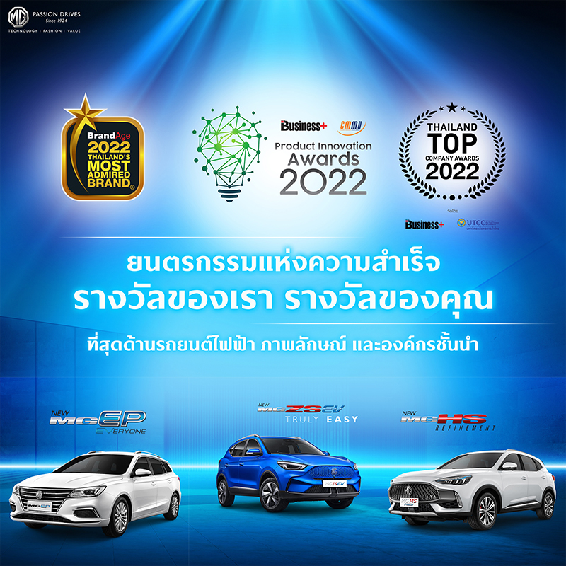 บริษัท เอสเอไอซี มอเตอร์ – ซีพี จำกัด และ บริษัท เอ็มจี เซลส์ (ประเทศไทย) จำกัด ผู้ผลิตและผู้จำหน่ายรถยนต์เอ็มจีในประเทศไทย เผยถึงความสำเร็จของแบรนด์ หลังได้รับรางวัลด้านแบรนด์ ผลิตภัณฑ์ และองค์กรชั้นนำ 4 รางวัล ได้แก่ รางวัลจากนิตยสาร BrandAge “2022 THAILAND’S MOST ADMIRED BRAND” ในกลุ่มรถยนต์ไฟฟ้า (EV) และรางวัลพิเศษ “GREENOVATION BRAND AWARD” และอีกสองรางวัลจากนิตยสาร BUSINESS+ รางวัล PRODUCT INNOVATION AWARDS 2022 ในกลุ่ม“รถยนต์พลังงานทางเลือก” จากรุ่น MG HS PHEV ติดต่อกัน 2 ปีซ้อน และรางวัล “THAILAND TOP COMPANY AWARDS 2022” ประเภทรางวัลความเป็นเลิศ “THE LEADERSHIP EXCELLENCE AWARD 2022” โดยทุกรางวัลที่เอ็มจีได้รับสะท้อนให้เห็นถึงภาพลักษณ์การเป็นแบรนด์ผู้นำด้านนวัตกรรมและเทคโนโลยียานยนต์ที่สามารถสร้างจุดเปลี่ยนและมาตรฐานใหม่ให้กับอุตสาหกรรมยานยนต์ในประเทศไทยได้เป็นอย่างดี