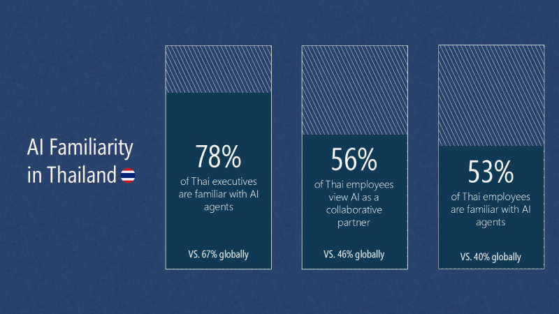 อัตราส่วนการใช้งาน AI agent ขององค์กรไทยที่สูงกว่าชาติอื่นๆ ยังสะท้อนออกมาในรูปของมุมมองที่พนักงานมีต่อ AI อีกด้วย โดย 56% ของพนักงานไทยมอง AI เป็นเหมือนเพื่อนคู่คิดที่แชร์ไอเดียกันในเวลาทำงาน ขณะที่ 43% มอง AI เป็นเครื่องมือที่ทำงานตามคำสั่งเท่านั้น (เฉลี่ยทั่วโลก 46% และ 52% ตามลำดับ)