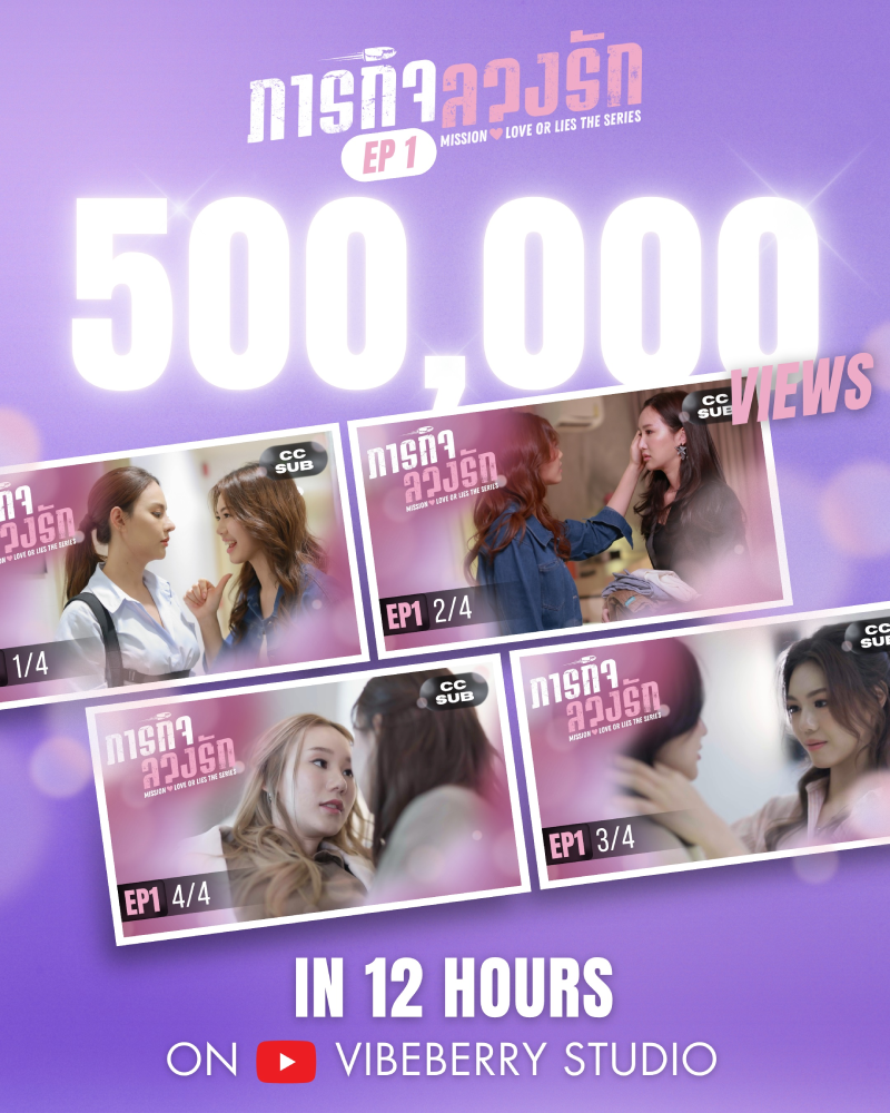 กระแสแรงตั้งแต่อีพีแรก สำหรับ “Mission Love or Lies ภารกิจลวงรัก” ซีรีส์ฟอร์มดีเคมีแรงแห่งปีเรื่องแรกจากค่าย Vibeberry Studio ที่เพิ่งประเดิมภารกิจแรกบน YouTube ไปเมื่อวันพุธที่ 29 ตุลาคมที่ผ่านมา ได้สร้างปรากฏการณ์กระแสตอบรับอย่างล้นหลาม เพียงไม่ถึง 12 ชั่วโมงหลังออนแอร์ ยอดวิวรวมทะยานพุ่งสูงถึง 500,000 ครั้ง และยังคงพุ่งขึ้นอย่างต่อเนื่องจนถึงขณะนี้ นอกจากยอดวิวที่แรงไม่หยุดแล้ว คอมเมนต์จากแฟน ๆ ทั่วประเทศยังแห่กันมา “ลงเรือ” เชียร์เคมีสุดฟินของ 4 สาวนักแสดงนำอย่างล้นหลาม ต่างคาแรกเตอร์แต่ลงตัวจนต้องจับตาดู!