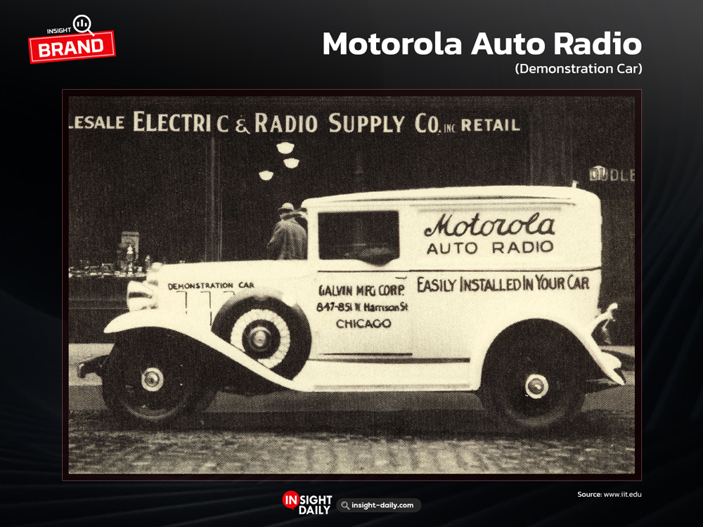 ปี 1930, เปิดตัววิทยุรถยนต์ภายใต้แบรนด์ “Motorola” เป็นครั้งแรก โดยชื่อแบรนด์ “Motorola” มาจากคำว่า “motor” หมายถึง “รถยนต์” ผสมกับคำว่า “ola” หมายถึง “เสียง”