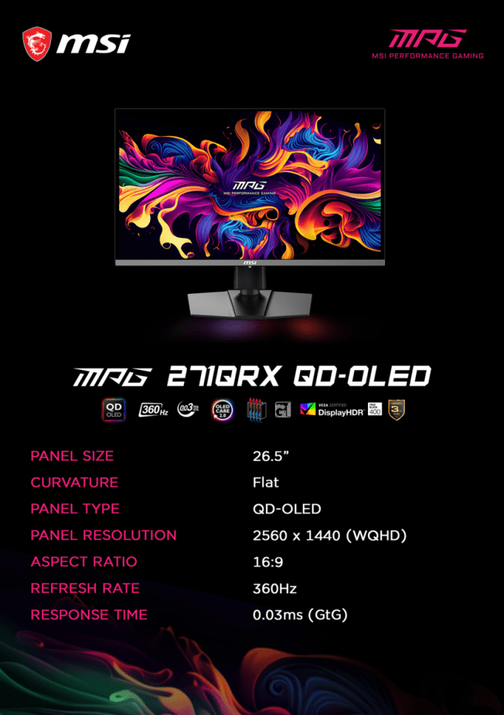 จอมอนิเตอร์ขนาด 27 นิ้ว 360Hz บนความละเอียด 2K บนจอตรง หากใครเป็นเกมเมอร์สาย FPS ที่ต้องการ Refresh rate สูง ต้องการความมั่นใจใน ทุกครั้งที่ลากหัว หรือสะบัดเมาส์ แต่หากใครต้องการรับชมความละเอียดคมชัดสูงเสมือนหลุดเข้าไปอยู่ใน โลกเกมนั้นจริงๆ ก็ต้องเป็น MPG 321URX QD-OLED 32 นิ้ว 4K ที่ให้ความละเอียดที่มากกว่าแต่ยังคง ความลื่นไหลไว้เอาใจสาย 4K เกมเมอร์ที่ 240Hz ซึ่งทั้งคู่ผ่านการทดสอบ และได้รับการรับรองผล VESA HDR TrueBlack และ VESA CLEAR MR ให้แน่ใจว่าสีดำนั้นเข้มสนิท ที่มาพร้อมการเคลื่อนไหวที่รวดเร็วระดับ 0.03 เสี้ยววินาที แต่ยังคงคุณภาพความคมชัดในแต่ละเฟรมได้อย่างเนียนกริบ
