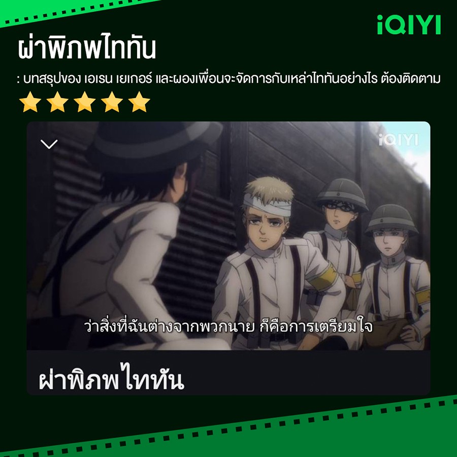 ตามมาด้วยอนิเมะระดับตำนานอย่าง ผ่าพิภพไททัน (Attack on Titan) กับเรื่องราวของ เอเรน เยเกอร์ เด็กหนุ่มที่ต้องเสียแม่ไปจากเหตุการณ์ไททันบุกเข้าทำลายวอลล์มาเรียในเขตชิกันชินา เอเรน มิคาสะ และอาร์มิน เข้าศึกษาที่โรงเรียนทหาร รุ่นที่ 104 เพื่อตั้งเป้าหมายจะเป็นเหล่าสำรวจ ออกไปสู้รบกับไททัน และออกไปดูโลกภายนอกกำแพง เวลาผ่านมาเกือบห้าปี หลังจากเหตุการณ์ที่ไททัน 60 เมตรบุกทลายวอลล์มาเรีย ทำให้มนุษย์ชาติต้องถอยร่นไปยังวอลล์โรเซ วันหนึ่ง ไททันตัวเดิมได้บุกเข้ามาอีกครั้ง และบุกเข้าทำลายวอลล์โรเซทางเขตทรอสทำให้ไททันบุกเข้ามากวาดล้างมนุษย์อีกครั้ง ประจวบเหมาะกับที่ทหารหน่วยสำรวจได้ออกไปสำรวจนอกกำแพงในระหว่างนั้นพอดี ทำให้ทหารฝึกหัดทุกหน่วยได้รับคำสั่งให้ออกกวาดล้างไททัน และคุ้มครองให้ประชาชนทุกคนหนีไปยังวอลล์ชีนา กำแพงชั้นสุดท้ายให้ได้ ในเหตุการณ์ครั้งนี้ทำให้ทหารฝึกหัดจำนวนมากต้องเสียชีวิตลงมากมาย รวมทั้งเอเรนที่ถูกไททันกินเข้าไปเพื่อช่วยเหลือเพื่อนของเขาอาร์มิน แต่เอเรนก็รอดตายมาได้ เพราะพลังบางอย่างที่สามารถแปลงร่างเป็นไททันที่เขาเองก็ไม่รู้ที่มาที่ไป ซึ่งตอนนี้เดินทางมาใกล้ถึงปฐมบทสุดท้ายของอนิเมะขึ้นหิ้งอย่าง Attack on Titan The Final บทสรุปของมหากาฬสงครามระหว่างมนุษย์และไททันจะเป็นอย่างไร เหล่านักสำรวจจะปราบไททันได้หรือไม่ รับชม Attack on Titan The Final Season Part 3 (ครึ่งแรก) ได้แล้ววันนี้บนแอปพลิเคชัน iQIYI (อ้ายฉีอี้) และเว็บไซต์ www.iQ.com