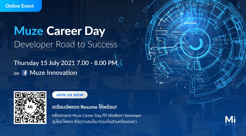 นอกจากนี้ Muze เตรียมจัดงาน Muze Career Day เป็นครั้งแรกในรูปแบบออนไลน์ผ่านช่องทางเพจเฟซบุ๊กของ Muze เพื่อเฟ้นหาและสร้างทีมดีเวลลอปเปอร์รุ่นใหม่ที่จะมาร่วมทีมกับ Muze รวมถึงเปิดโอกาสให้ผู้ที่สนใจ ได้รู้จัก Muze มากขึ้น โดยผู้ที่สนใจสามารถเข้าไปลงทะเบียนร่วมงาน “Muze Career Day” ได้แล้วตั้งแต่วันนี้ โดยงานจะจัดขึ้นวันที่ 15 กรกฎาคม 2564 เวลา 19.00 – 20.00 น. หากต้องการข้อมูลเพิ่มเติมสอบถามได้ที่ 094 464 6554 หรือ Inbox สอบถามได้ที่เพจเฟซบุ๊ก Muze Innovation หรือลงทะเบียนออนไลน์ได้ที่ www.jotform.com/form/211799085576471