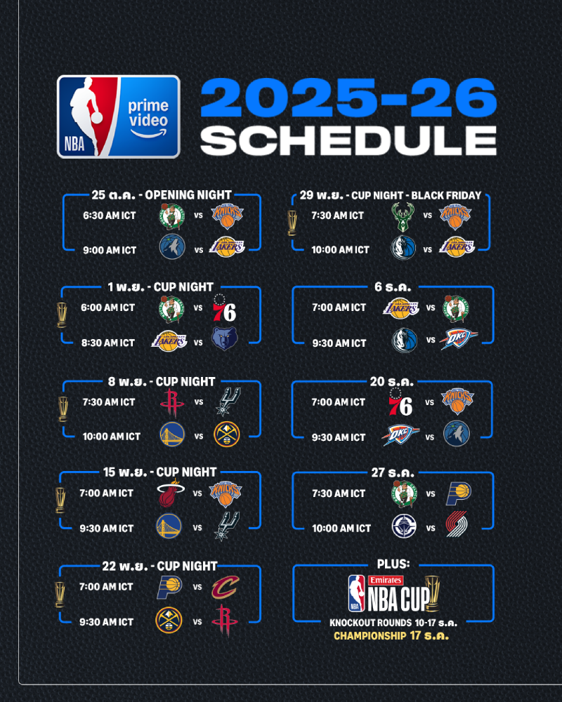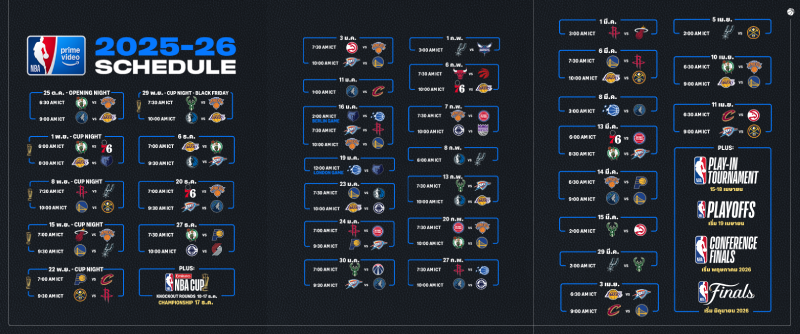 Prime Video ประกาศตารางการแข่งขันเต็มรูปแบบฤดูกาลแรกของ NBA on Prime Video หลังจากที่ NBA ได้เผยโปรแกรมการแข่งขันฤดูกาลปกติ 2025-2026 อย่างเป็นทางการ โดย NBA on Prime Video จะเปิดฤดูกาลด้วยการแข่งขันคู่แรกในวันเสาร์ที่ 25 ตุลาคม เวลา 6.30 น. (ตามเวลาประเทศไทย) โดยทีมนิวยอร์ก นิกส์ จะเปิดบ้านต้อนรับ ทีมบอสตัน เซลติกส์ ต่อด้วยการต่อสู่ระหว่าง ทีมมินนิโซตา ทิมเบอร์วูล์ฟส์ กับ ทีมลอสแอนเจลิส เลเกอร์ส เวลา 9.00 น. (ตามเวลาประเทศไทย) พร้อมการถ่ายทอดสดรายการก่อนเกม NBA on Prime Video เริ่มตั้งแต่เวลา 6.00 น.