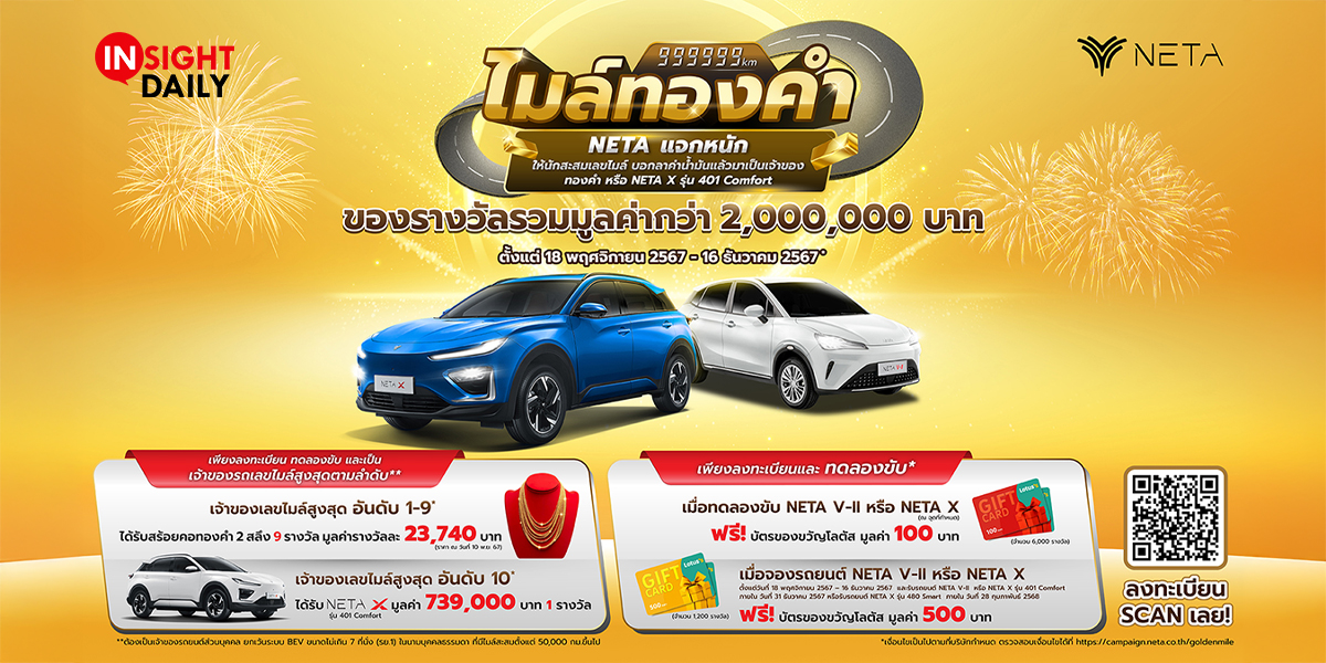 บริษัท เนต้า ออโต้ (ไทยแลนด์) จำกัด เดินหน้าเปิดตัวแคมเปญส่งท้ายปี รับเทศกาลแห่งความสุข “โกลเด้น ไมล์ (Golden Miles) NETA แจกหนัก ให้นักสะสมเลขไมล์” ชวนบอกลาค่าน้ำมัน ยิ่งเลขไมล์เยอะยิ่งเพิ่มโอกาส รับรางวัลใหญ่ ถึง 10 รางวัล สำหรับเจ้าของรถที่เลขไมล์สะสมสูงสุด 10 อันดับแรก ลำดับที่ 1 ถึง 9 ได้รับสร้อยคอทองคำ 2 สลึง ลำดับที่ 10 ได้ NETA X รุ่น 401 Comfort และยังมีรางวัลพิเศษอื่น ๆ อีกมายมายเมื่อทดลองขับ หรือจองรถ รวมมูลค่ากว่า 2,000,000 บาท สามารถร่วมแคมเปญ “โกลเด้น ไมล์” ได้ที่ campaign.neta.co.th/goldenmile/register ตั้งแต่ 18 พฤศจิกายน – 16 ธันวาคม 2567 ประกาศผู้โชคดี 25 ธันวาคม 2567