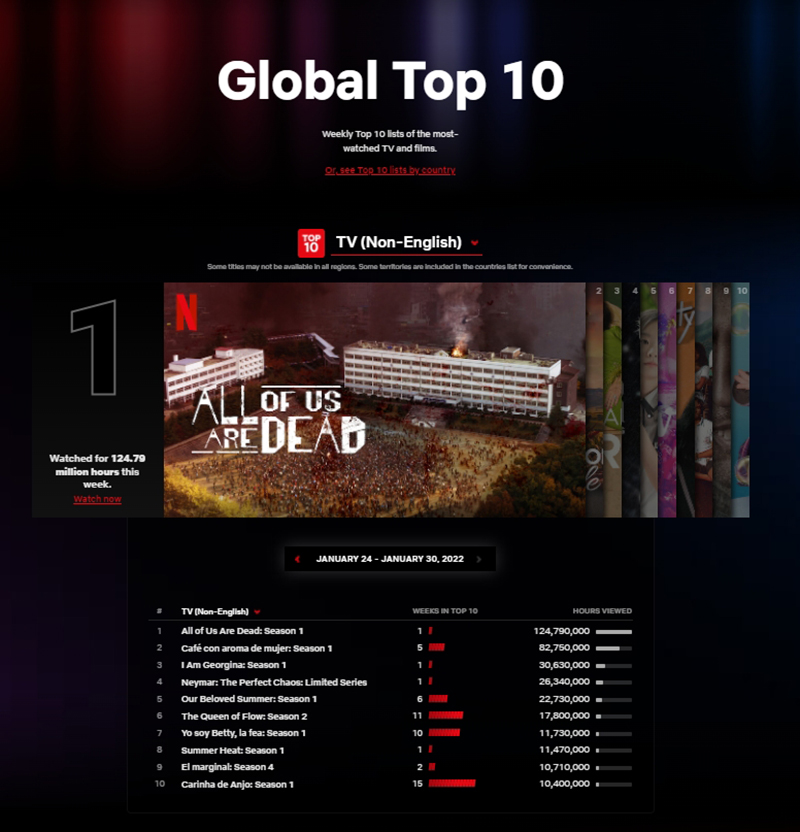 หลังจากที่ซีรีส์ มัธยมซอมบี้ (All of Us Are Dead) ออกฉายทาง Netflix บริการสตรีมมิ่งความบันเทิงระดับโลก ไปสดๆ ร้อนๆ ซีรีส์เรื่องนี้ก็พุ่งแรงติดอันดับ Netflix Top 10 (หมวดรายการทีวีภาษาต่างประเทศ) ใน 91 ประเทศทั่วโลก ถือเป็นข้อพิสูจน์ถึงพลังและความนิยมของคอนเทนต์เกาหลีในระดับโลกอีกครั้ง