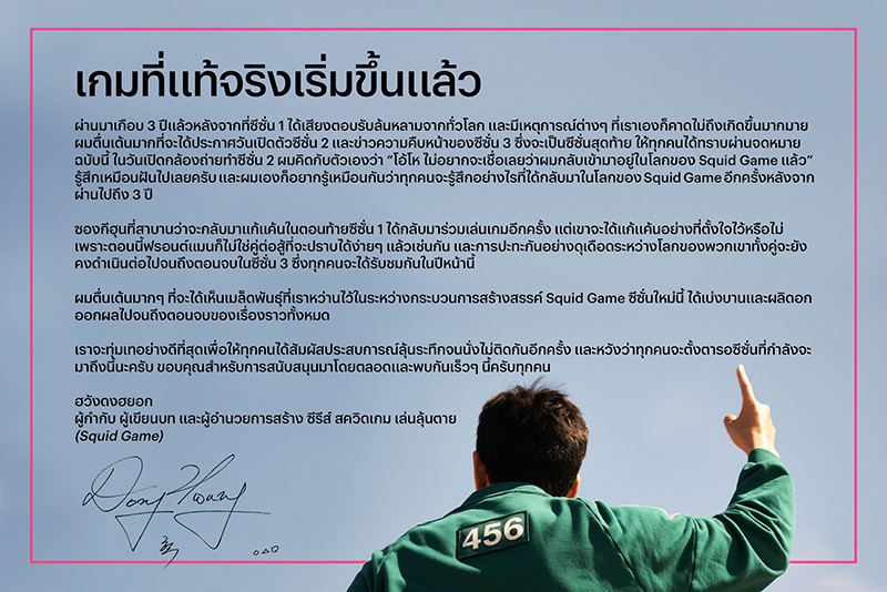 Netflix ร่อนจดหมายเปิดผนึกจากฮวังดงฮยอก ผู้กำกับ ผู้เขียนบท และผู้อำนวยการสร้างซีรีส์ สควิดเกม เล่นลุ้นตาย (Squid Game) ที่เขียนบอกเล่าความรู้สึกจากใจส่งไปถึงแฟนๆ ทั่วโลก เพื่อประกาศอย่างเป็นทางการว่า ซีรีส์ สควิดเกม เล่นลุ้นตาย (Squid Game) ซีซั่น 2 กำลังจะกลับมาสร้างปรากฏการณ์อีกครั้งอย่างยิ่งใหญ่ โดยจะสตรีมให้แฟนๆ ได้รับชมพร้อมกันทั่วโลกในวันที่ 26 ธันวาคม 2024 และเตรียมพบกับซีซั่นสุดท้ายได้ในปี 2025!